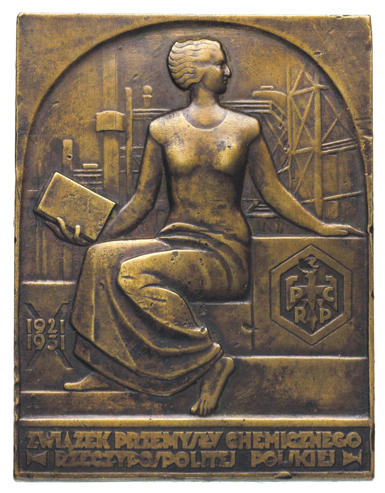 PLAKIETY, Związek Przemysłu Chemicznego-plakieta sygn. J. Aumiller, wykonana na 10-lecie Związku, 1931 r,; Siedząca kobieta na wprost ze zwróconą głową w lewo na tle instalacji zakładów chemicznych, w polu po lewej daty 1921/1931, poniżej napis ZWIĄZEK PRZEMYSŁU CHEMICZNEGO/ RZECZPOSPOLITEJ POLSKIEJ, brąz 63 x 81 mm, Strzałkowski 42, bardzo rzadka