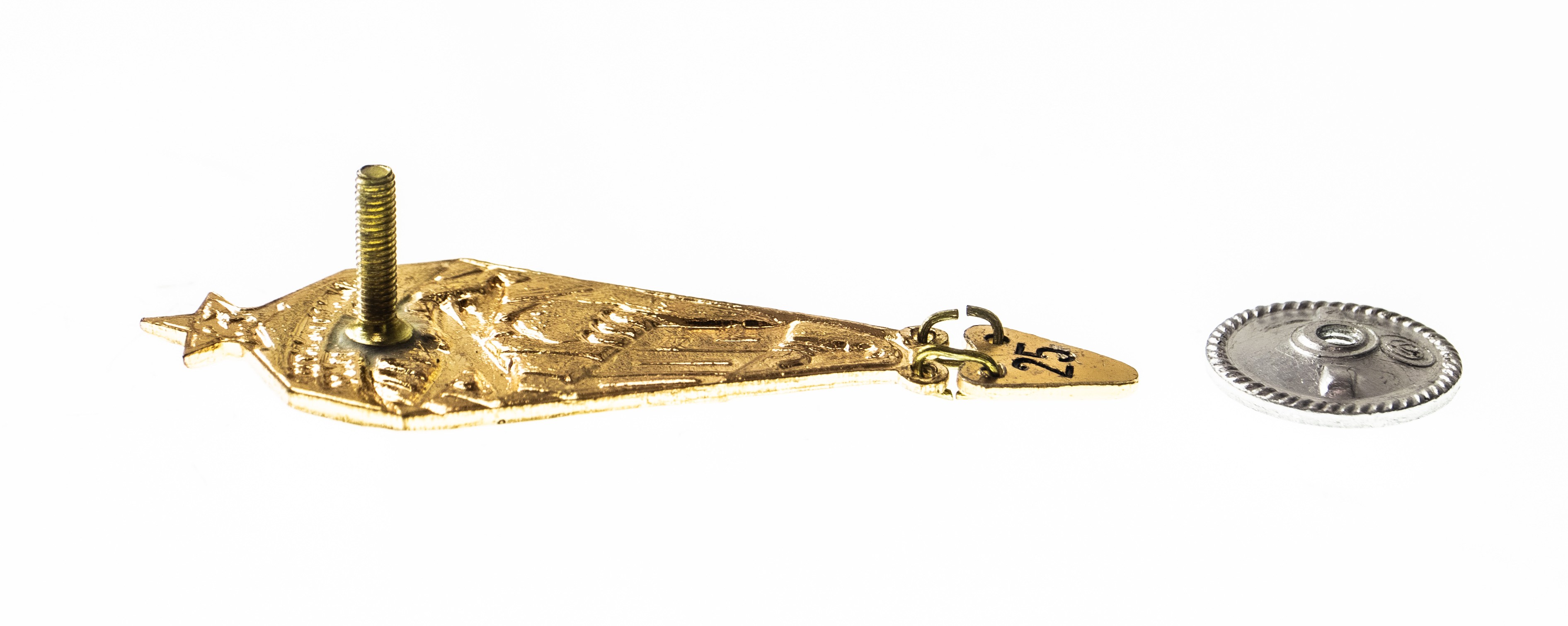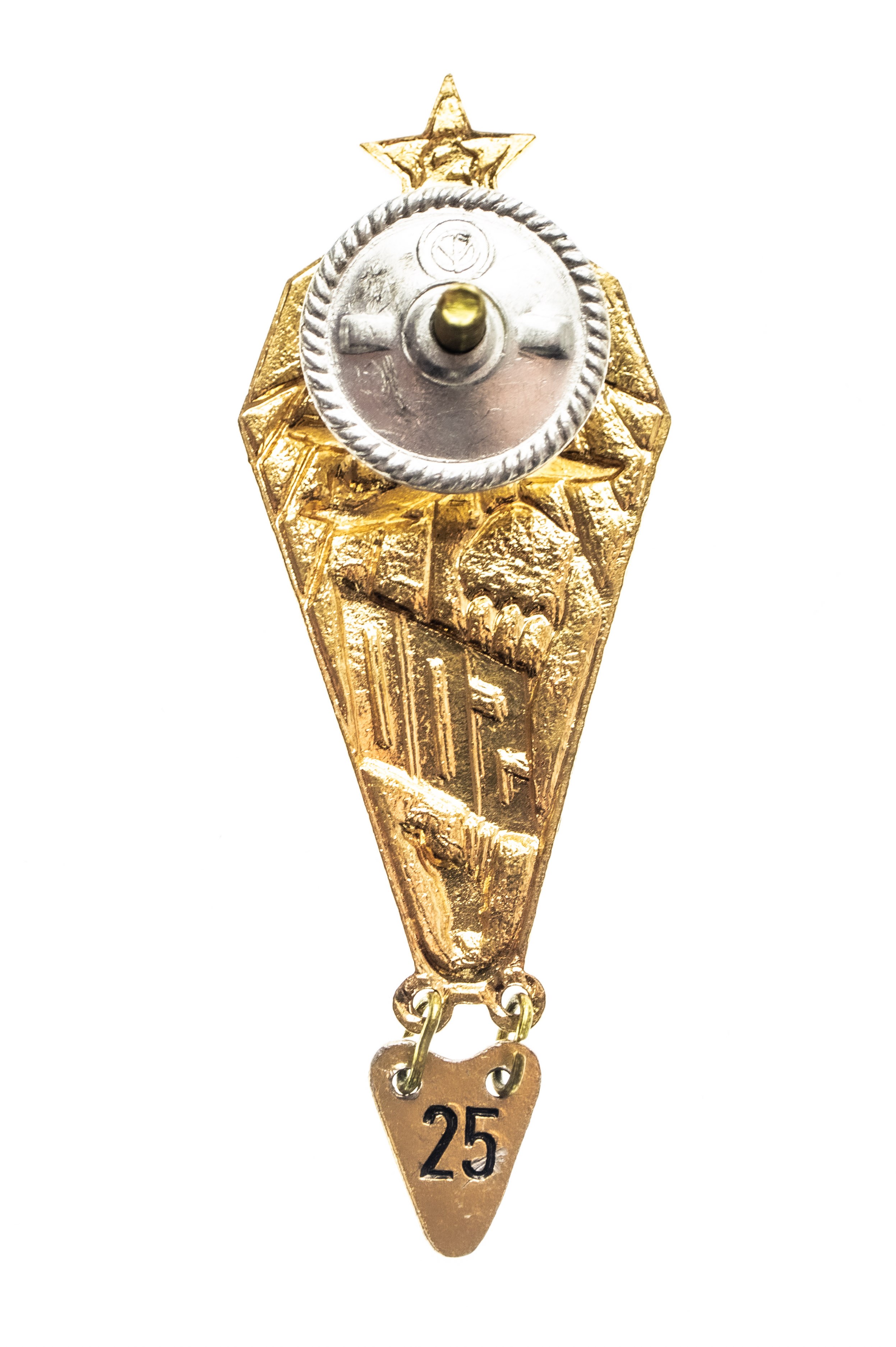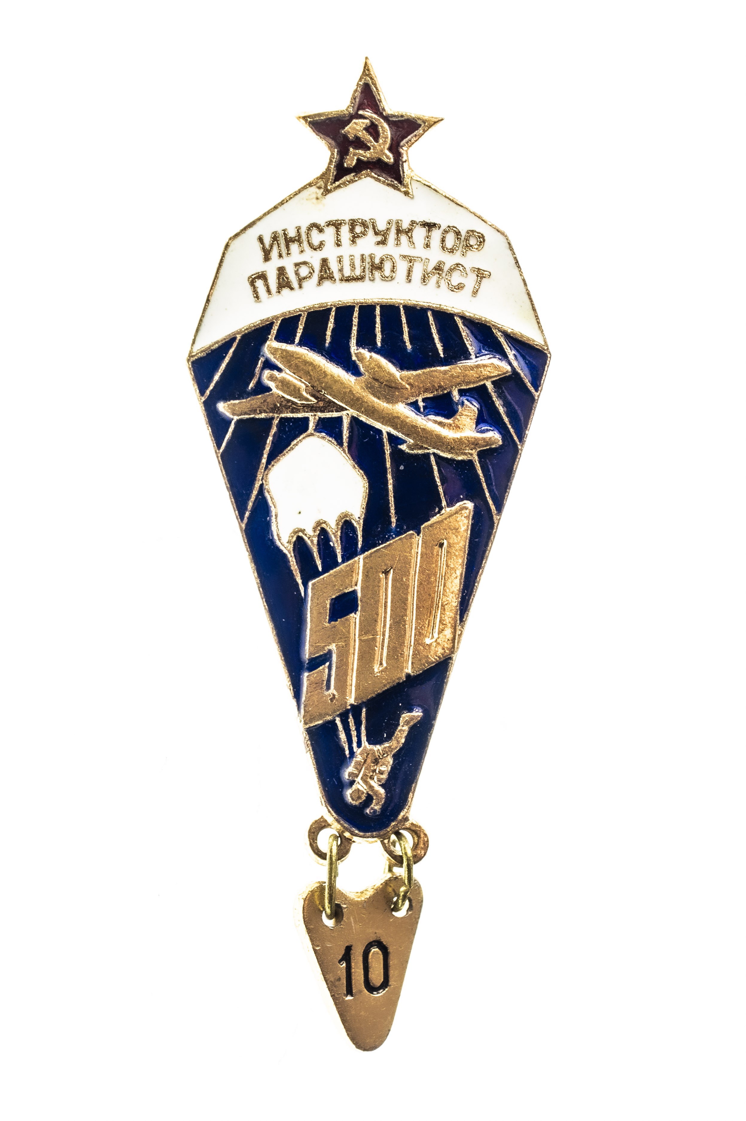 Radziecka odznaka wojskowa – Instruktor Spadochronowy, który wykonał ponad 500 skoków, zawieszka prawdopodobnie pokazuje liczbę skoków, które przekroczyły 500. Wysokość z zawieszką około 7 cm. Mocowanie na słupku.