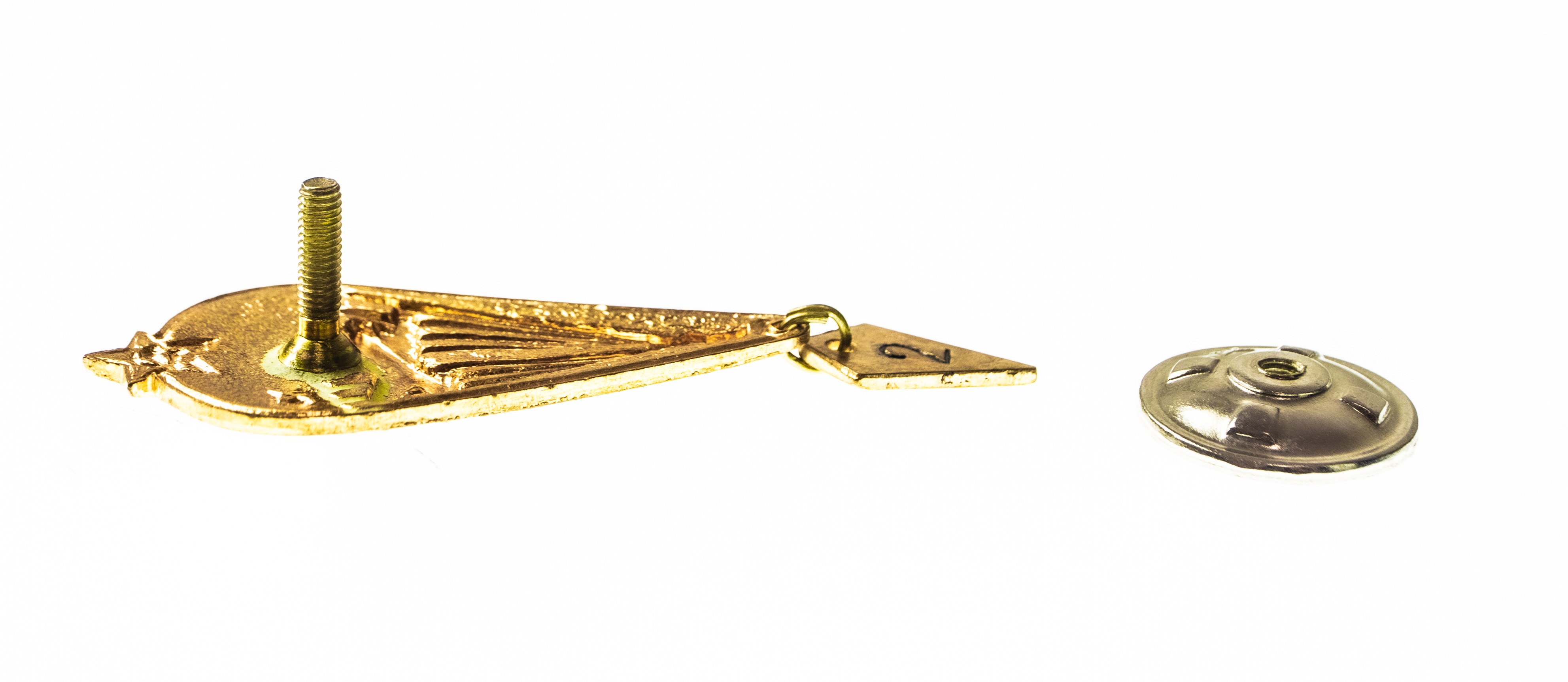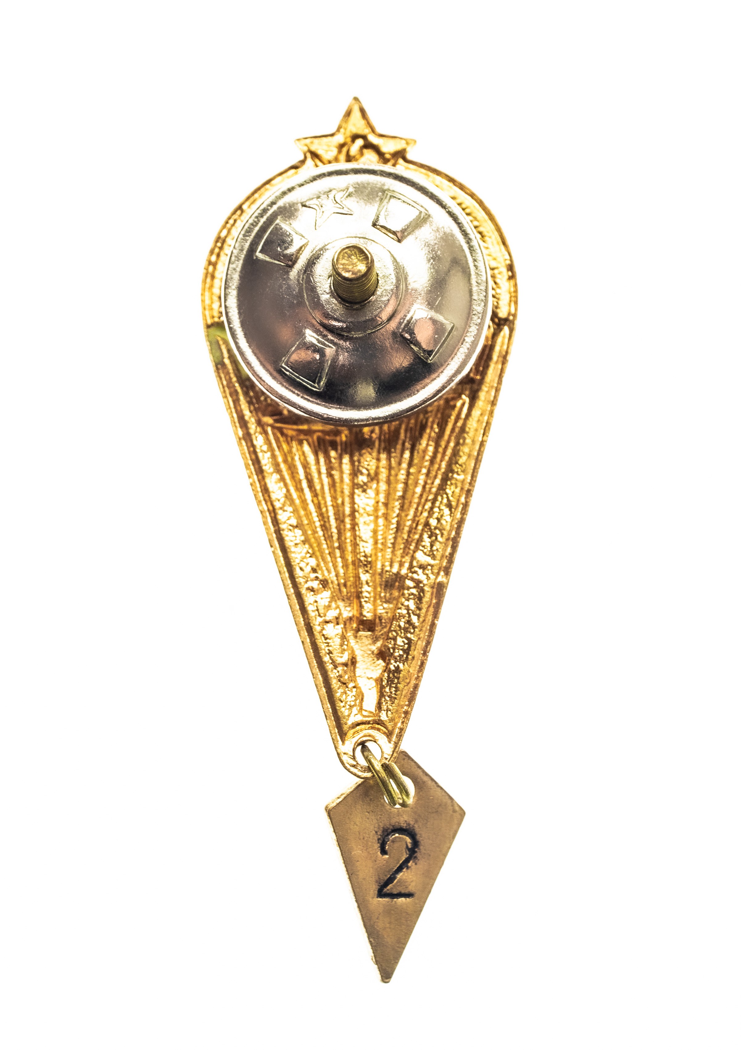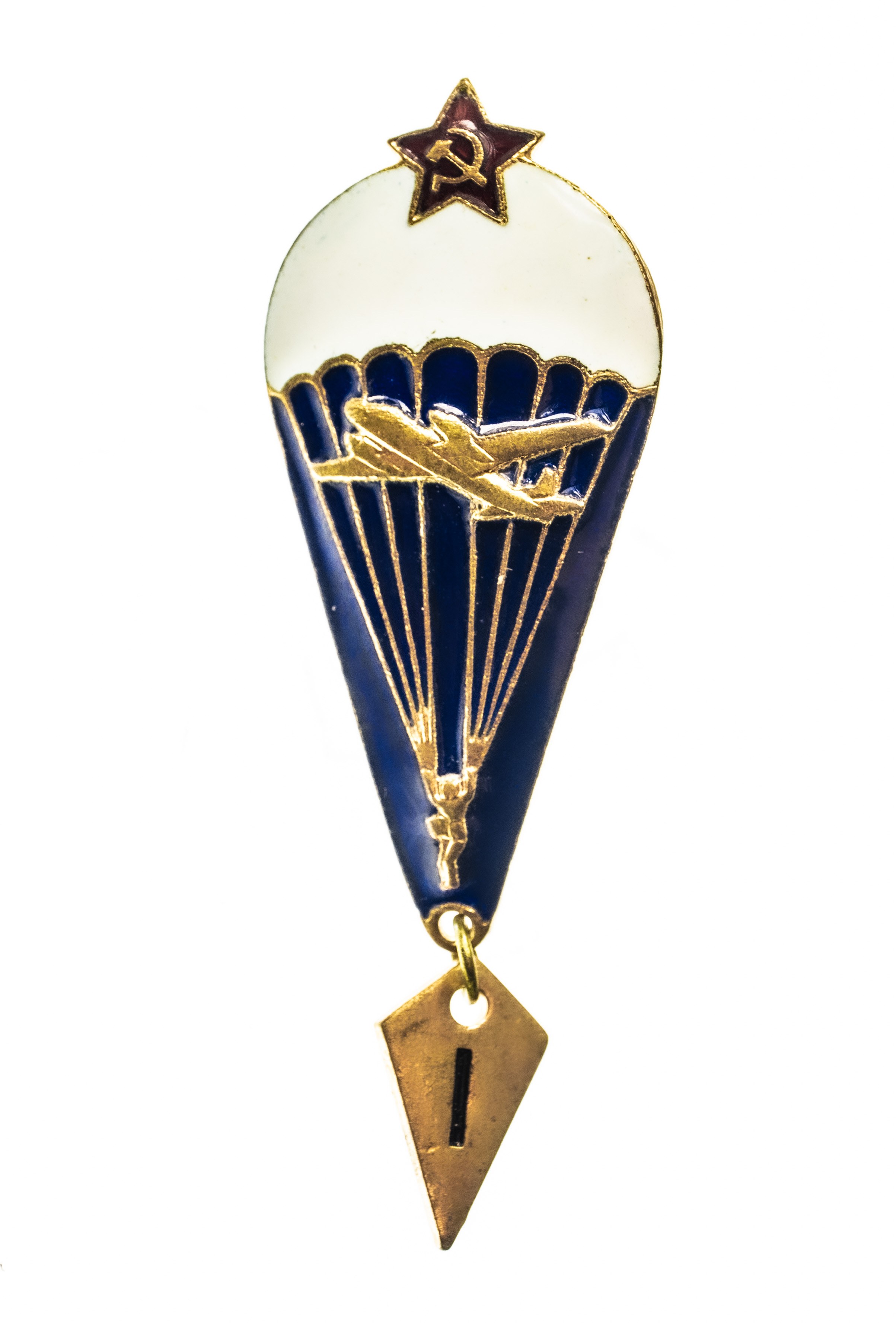 Radziecka odznaka wojskowa – Skoczek Spadochronowy, który wykonał pierwszy skok. Wysokość z zawieszką około 6,5 cm. Mocowanie na słupku.