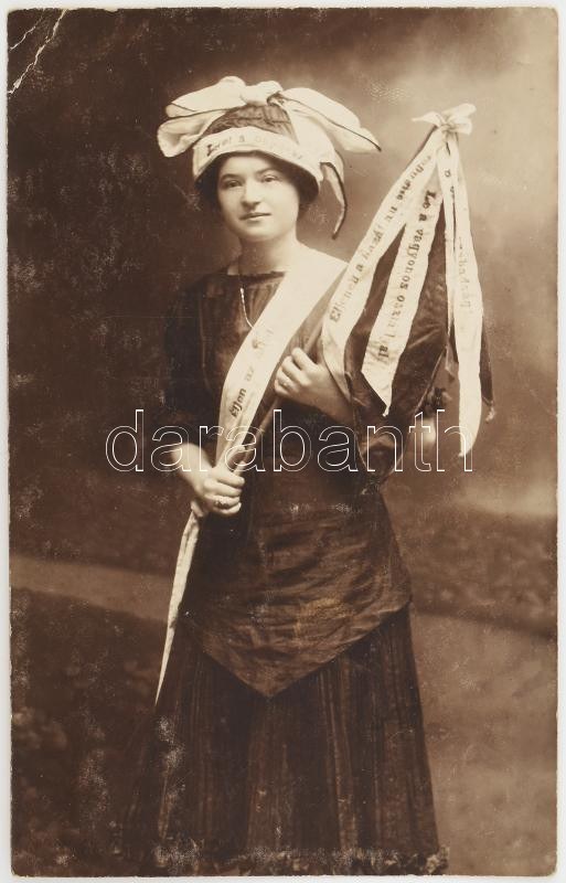 1914 Temesvár, korai kommunista hölgy, agitációs feliratokkal: (le a vagyonos osztállyal, stb...