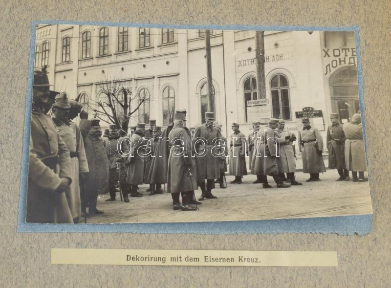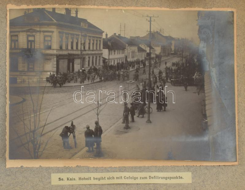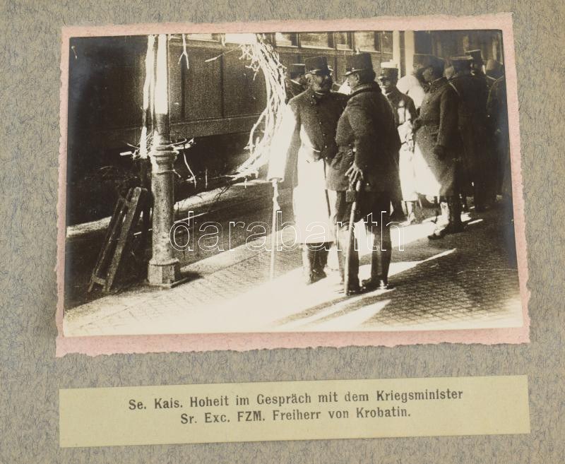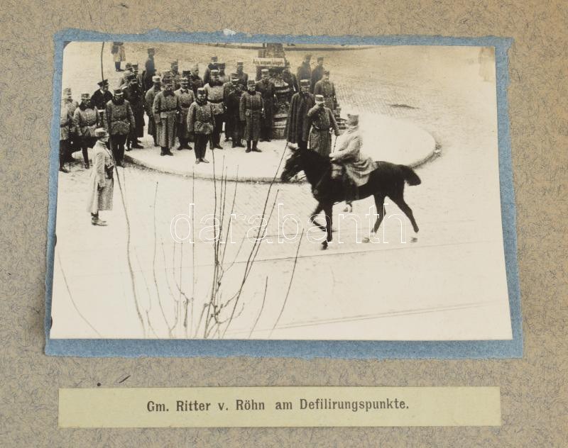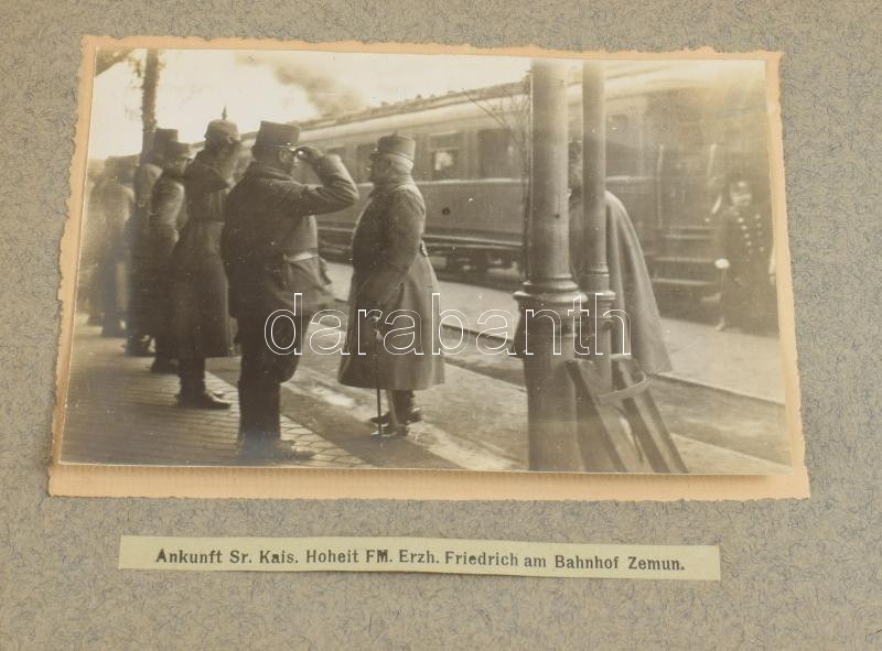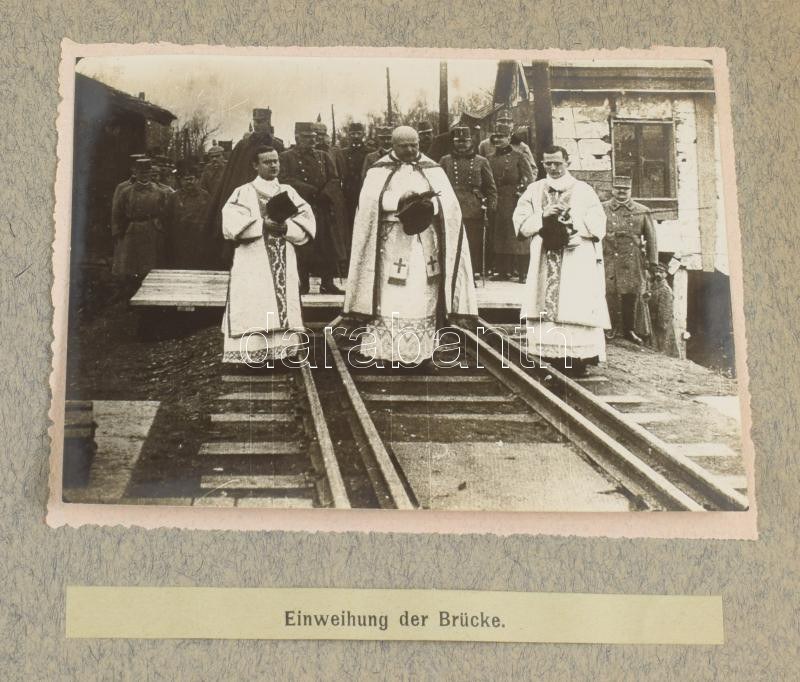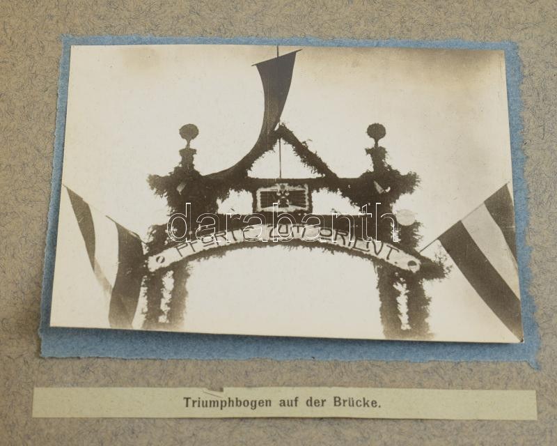 1915 [Osztrák-magyar csapatok az elfoglalt Belgrádban] Erinnerung an Belgrad. Városképek, Frigyes főherceg látogatása a városban és a fronton, osztrák-magyar katonák kitüntetése, A felrobbantott vasúti híd újjáépítése és felavatása, stb. Összesen 60 db látványos fotó, alatta nyomtatott felírással, aranyozott egészbőr albumban 26x19 cm 1915 [Austro-Hungarian troops in occupied Belgrade] Erinnerung an Belgrad. Cityscapes, Archduke Frederick's visit to the city and the front, decoration of Austro-Hungarian soldiers, reconstruction and inauguration of the blown-up railway bridge, etc. A total of 60 spectacular photos, with printed captions underneath, in a gilded full-leather album 26x19 cm