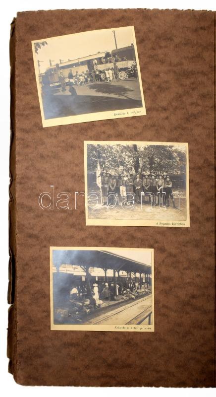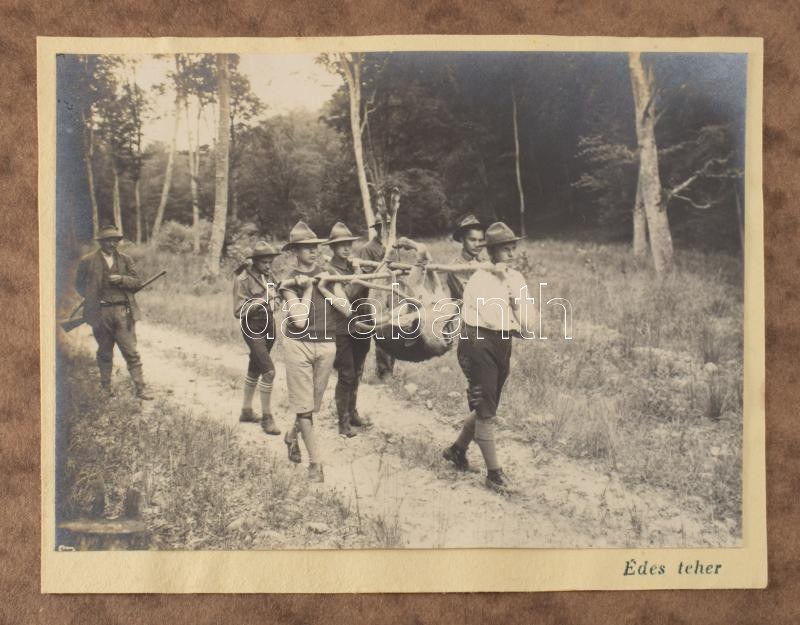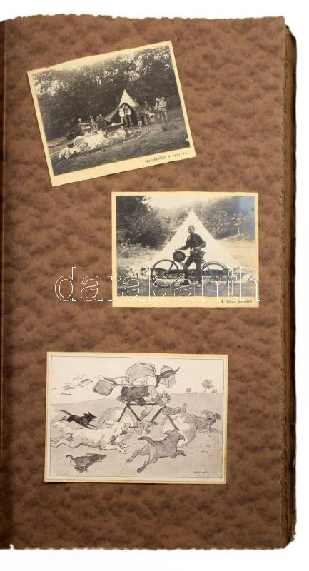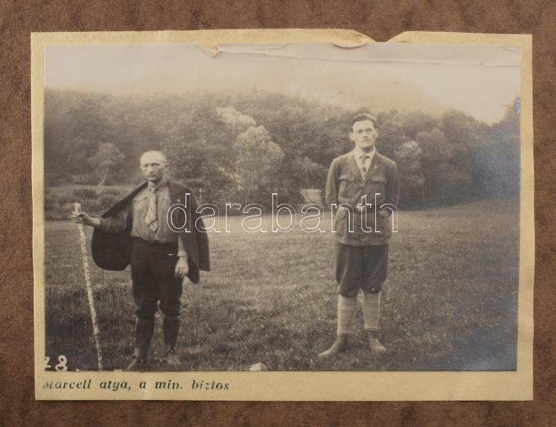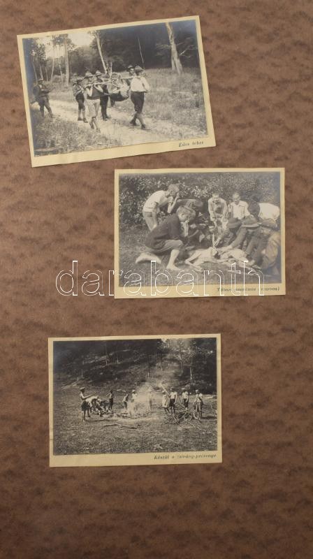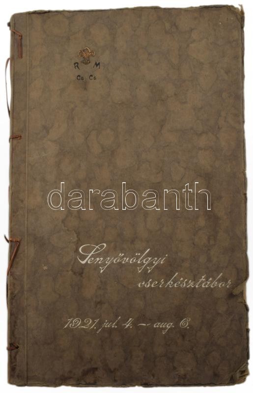 1921 R[egnum] M[arianum] cs[erkész]cs[apat] Senyővölgyi cserkésztábor 1921. jul. 4. - aug. 6. fotóalbum, 96 nagyrészt feliratozott fotókkal, valamint 5 képeslappal, a képeslapokon Márton Lajos grafikákkal. Rajtuk tábori életképekkel, vadászattal, főzéssel, kirándulással (pl.: füzéri várban.) "Cserkészlilomos R. M: Cs. Cs. feliratú" papír fotóalbumban, foltos borítóval, a széleken kis szakadásokkal, fotóalbum: 39,5x24,5 cm, fotók: 4,5x10,5 cm és 11x8 cm közötti méretben, képeslapok: 9x13 cm