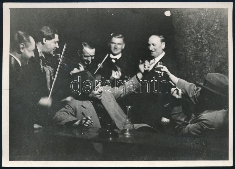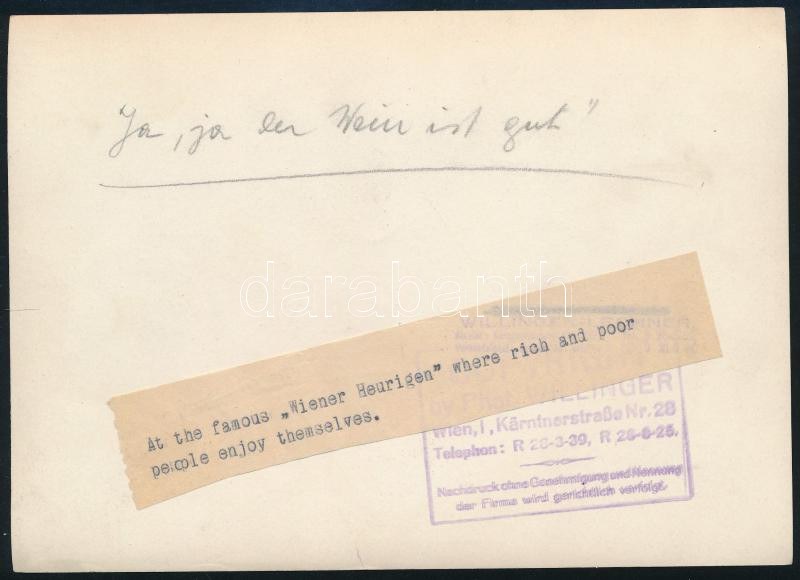 1935 "Igen, igen, a bor jó!" A bécsi "Wiener Haurigen" étterem és tavernában készített fotó, ahol a szegény és gazdag ember egyformán érzi magát, Wilhelm Willingen (1879-1943) fotós pecsétjével és szövegével a hátoldalon, jó állapotban, 13×18 cm