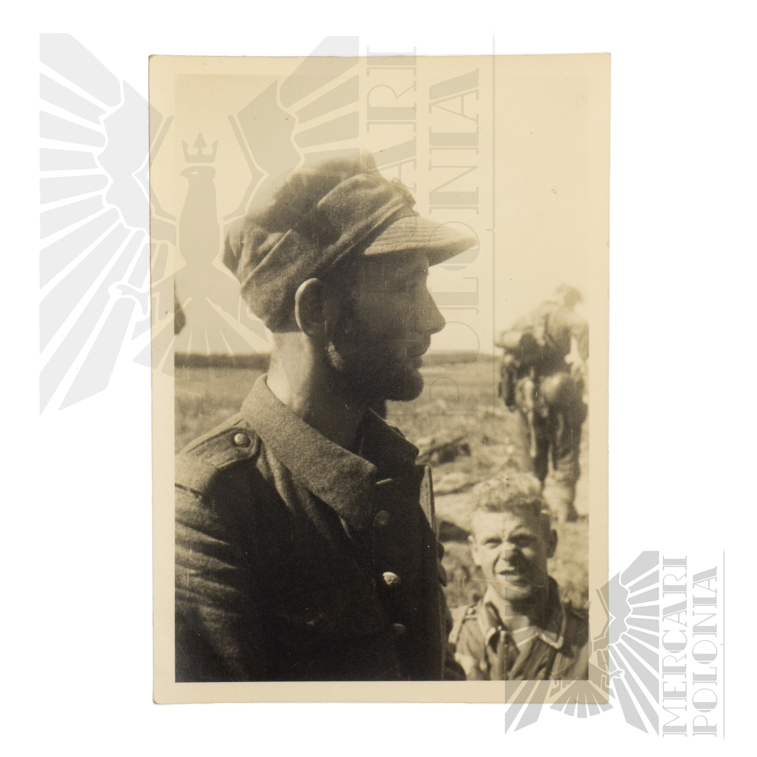 Zdjęcie o wymiarach 91 mm x 63 mm przedstawiające polskiego żołnierza wziętego do niewoli przez Niemców. Dobrze uchwycona na zdjęciu czapka polowa wz. 37.