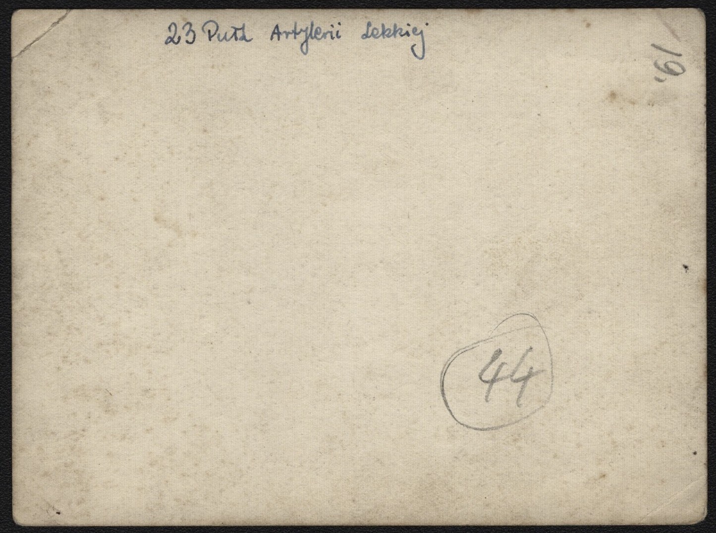 Fotografia o wym. 8,7 x 11,7 cm. Opis. piórem na rewersie. Zagięcia rogów.