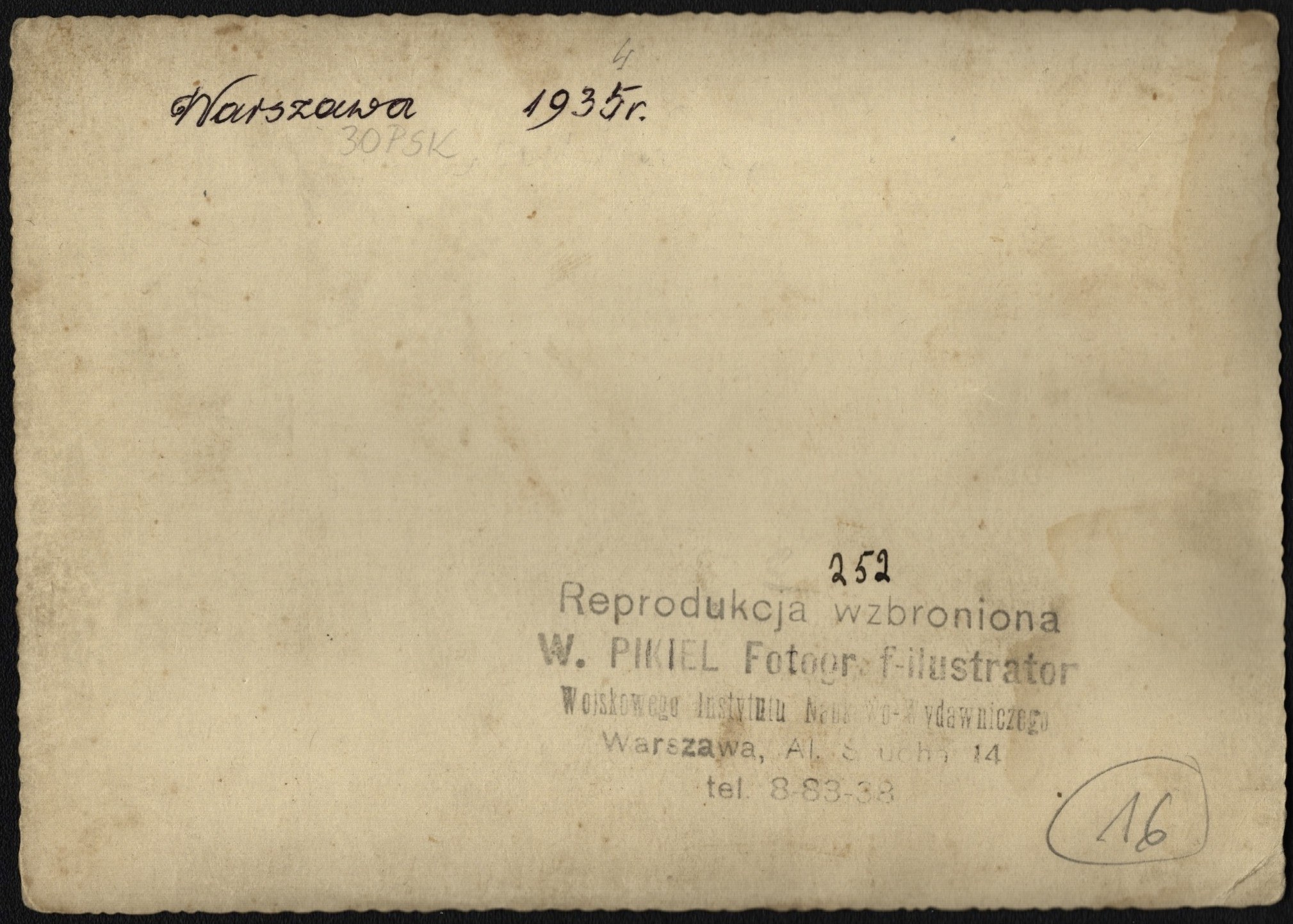 Fotogr. o wym. 12 x 16,5 cm. Na rewersie opis długopisem oraz pieczątka zakładu W. Pikiela z Warszawy. Zagięcia fotografii, zabrudzenia rewersu.