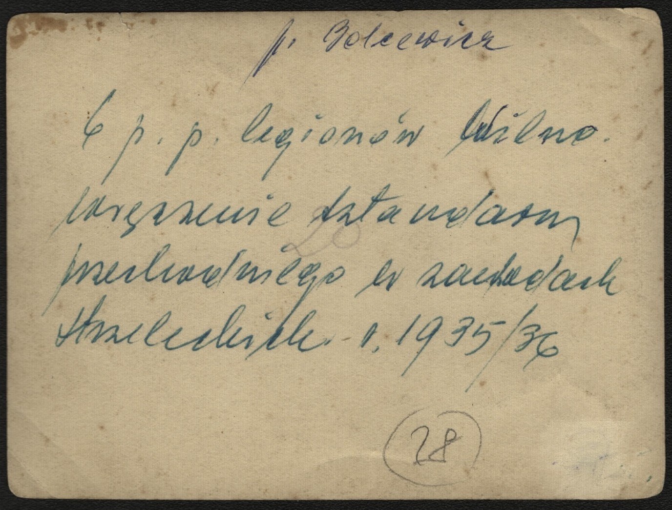 Fotografia o wym. 8,5 x 11,4 cm. Opisana na rewersie. Zagięcia i zabrudzenia rewersu.