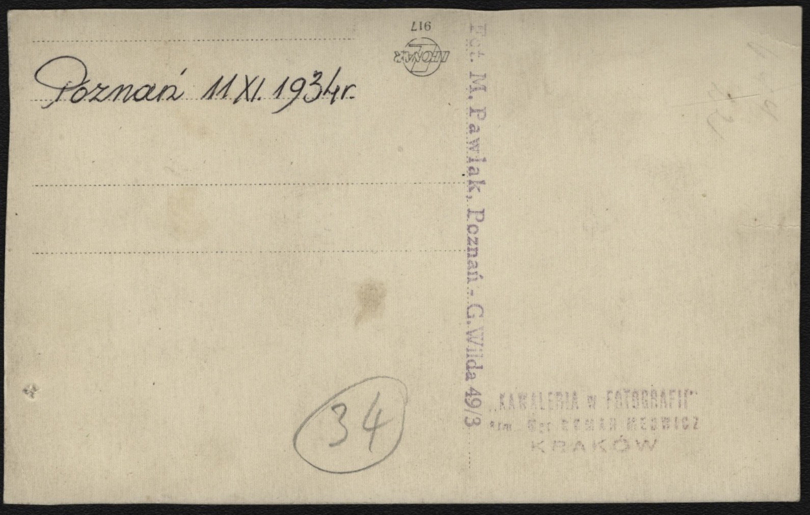 Fotografia o wym. 8,3 x 13,2 cm. Fot. M. Pawlak, Poznań. G. Wilda 49/3. Opis na rewersie oraz pieczątki.