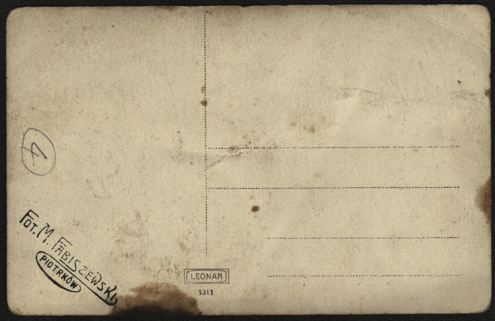 Fotografia na papierze Leonar o wym. 13,5 x 8,5. Pieczęć na rewersie: Fot. M. Fabiszewski, Piotrków. Zagięcia i załamania fotografii. Nadwątlenia brzegów.