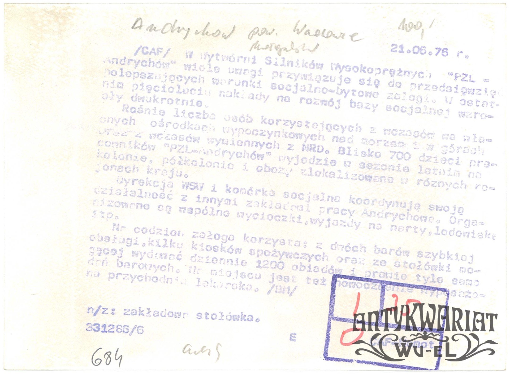 ANDRYCHÓW (pow. Wadowice). Wytwórnia Silników Wysokoprężnych PZL Andrychów, zakładowa stołówka. Fot. CAF - Momot, 21.06.1976 r.; stan bardzo dobry, wymiary: 17,9 x 13,1 cm.