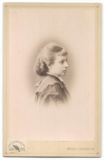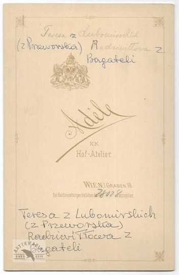 Ujęcie w popiersiu, z profilu. Na dolnym marginesie podkładu wyzłoc. nadruk.: "Adele Wien, I. Graben 19.". Zdjęcie naklejone na oryg. kartonowy podkład ze złoc. brzegami. Na odwrocie reklamowa wyzłoc. winieta zakładu i oraz odręczny napis identyfikujący: "Teresa z Lubomirskich (z Przeworska) Radziwiłłowa z Bagateli". Stan bardzo dobry.