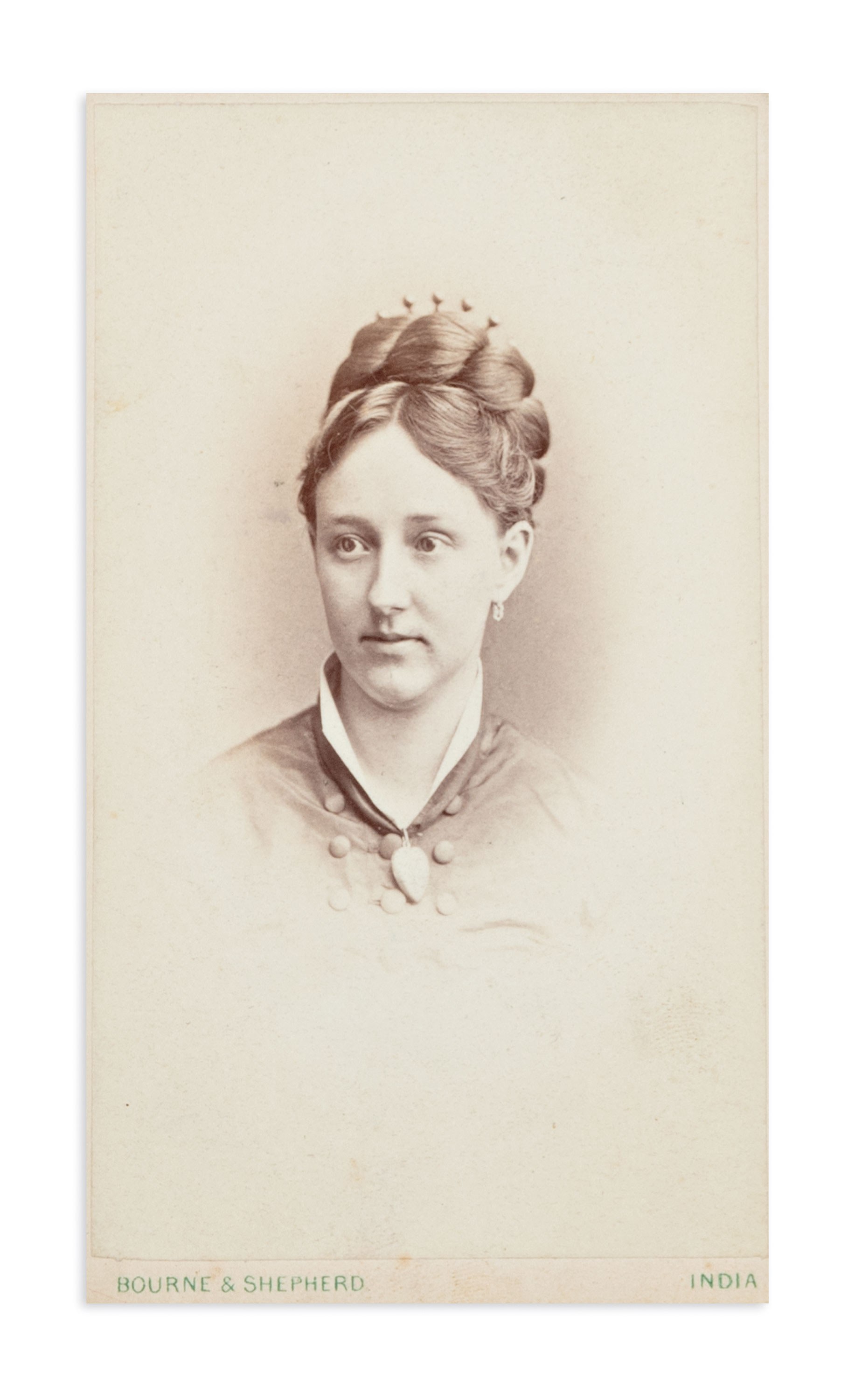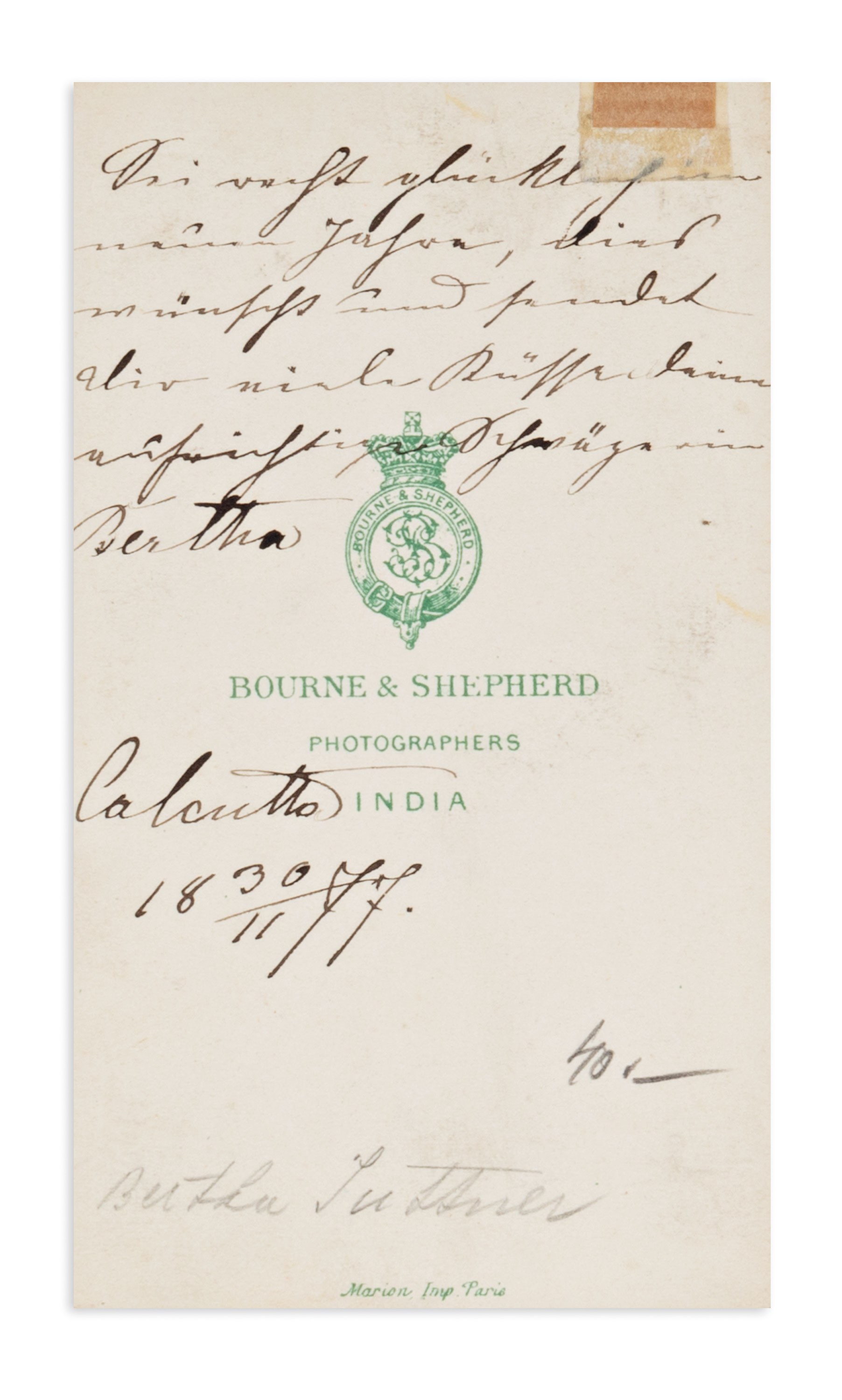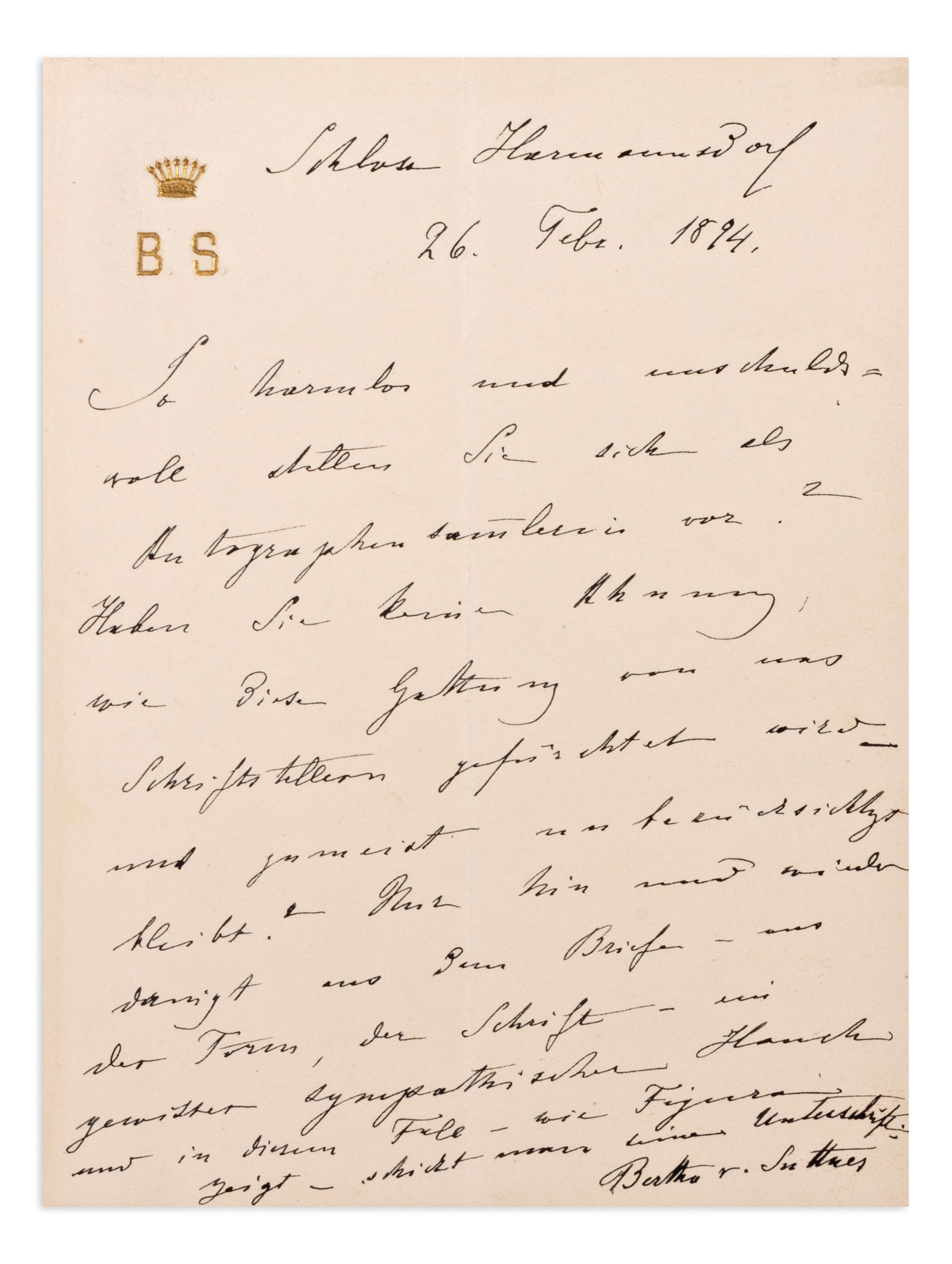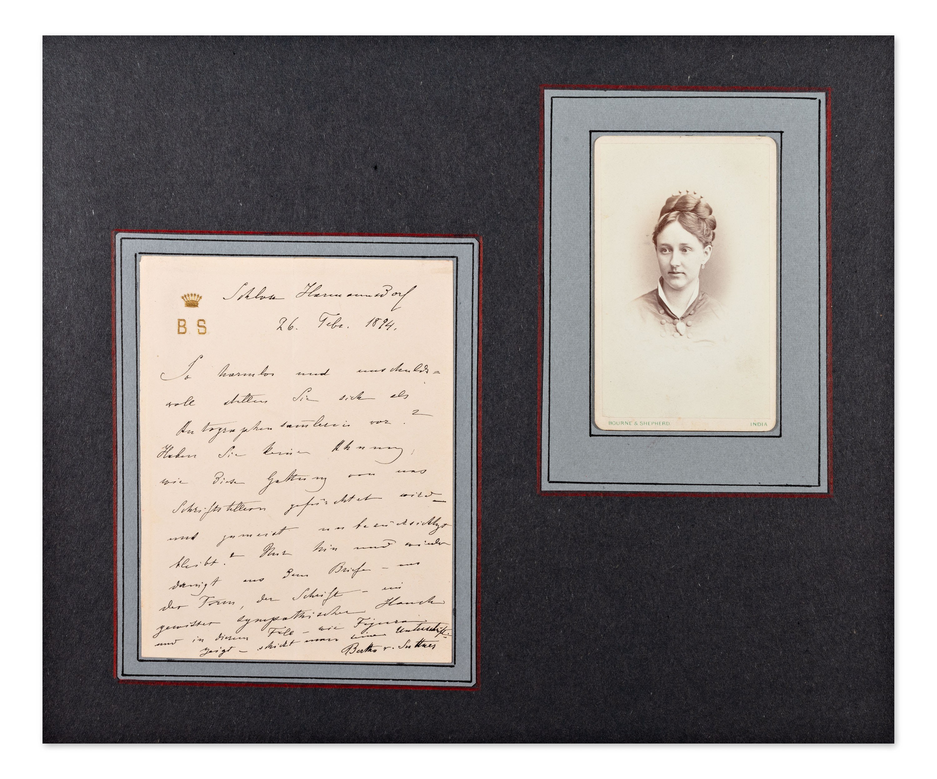 Handwritten letter on embossed monogrammed letterhead (B. S.) dated Schloss Harmannsdorf, February 26, 1894. The letter, written in an elegant hand, documents the correspondence of this prominent Austrian pacifist and writer, the first woman to be awarded the Nobel Peace Prize (1905).Included in the collection is a rare period photograph of Bertha von Suttner, taken at the renowned Indian studio Bourne & Shepherd, Calcutta, 1877. The back of the photograph bears her handwritten signature and a short dedication, confirming her stay in India.