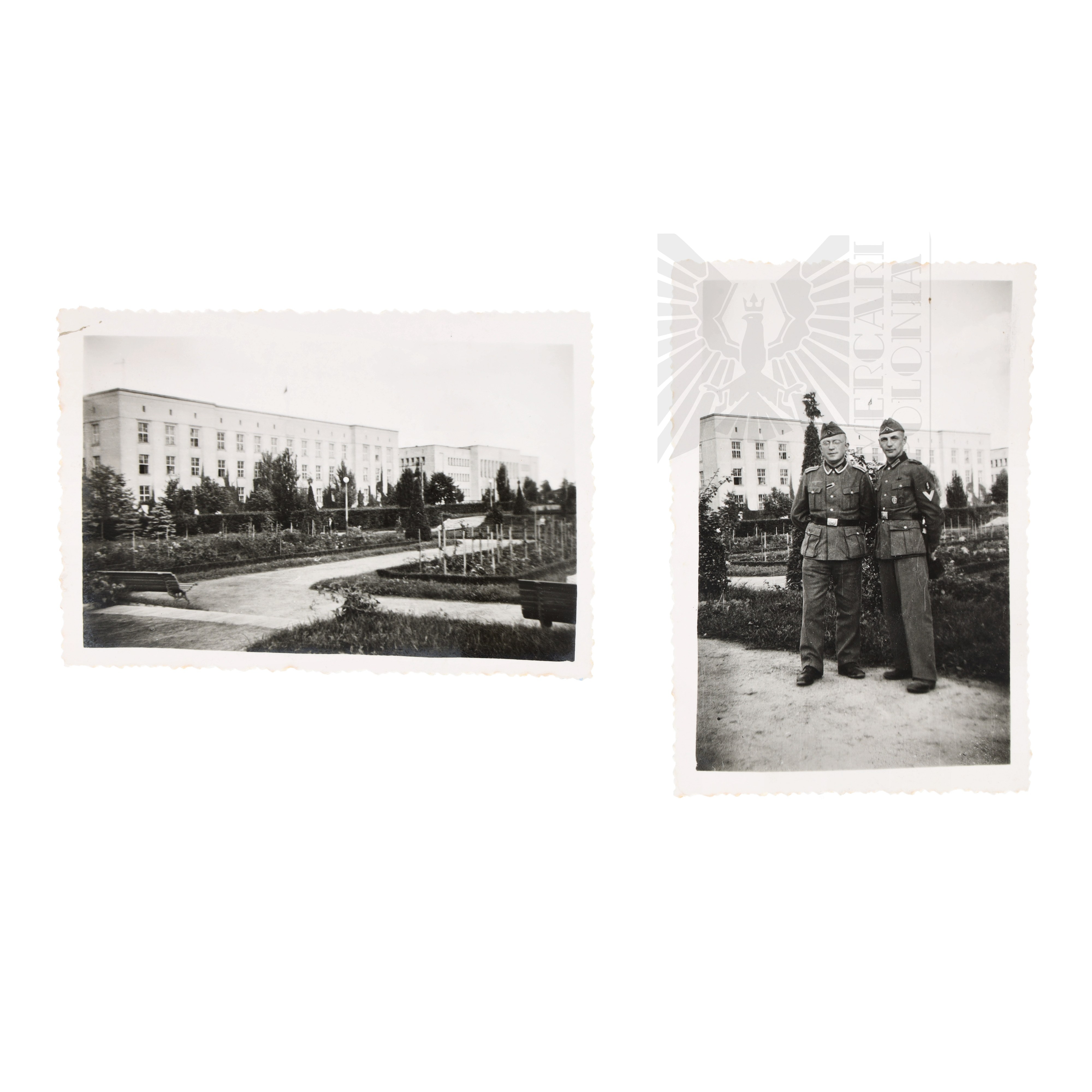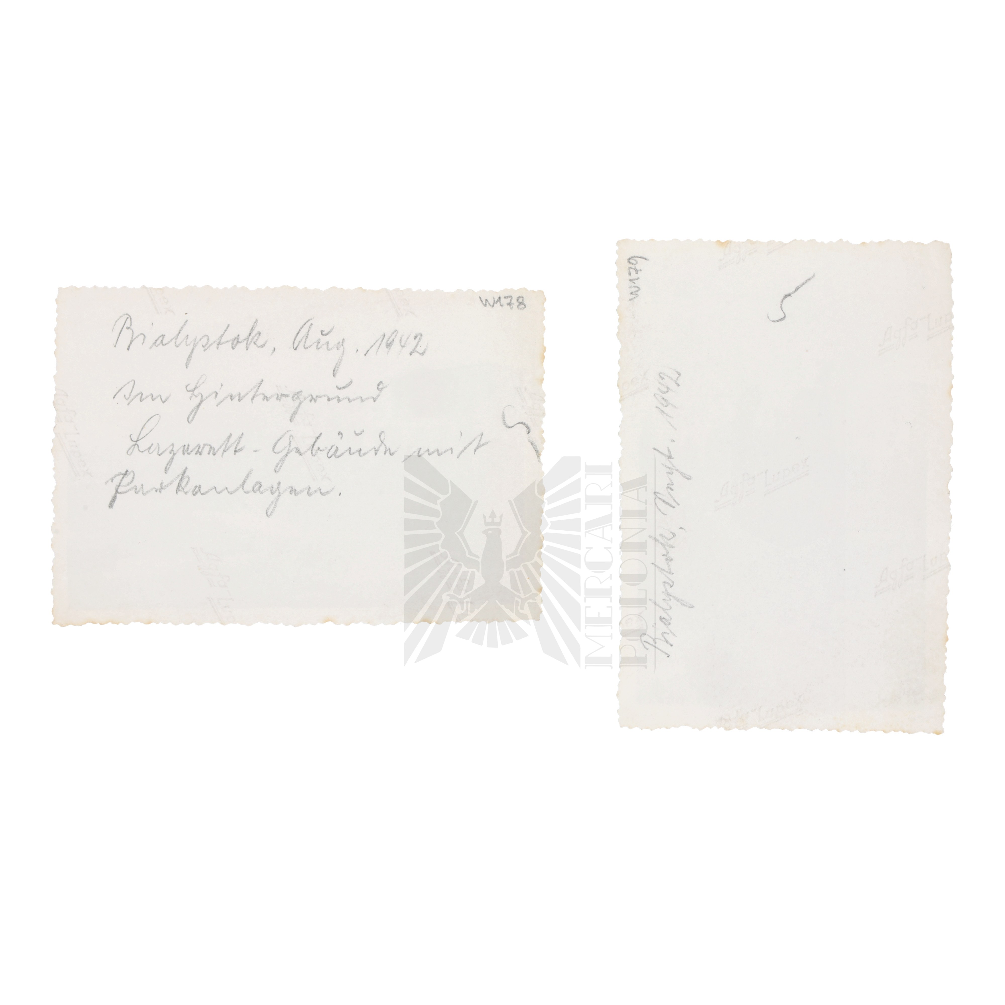 Dwie fotografie ukazujące Białystok podczas niemieckiej okupacji, na jednej fotografii widocznych dwóch żołnierzy Wehrmachtu pozujących na tle budynku.