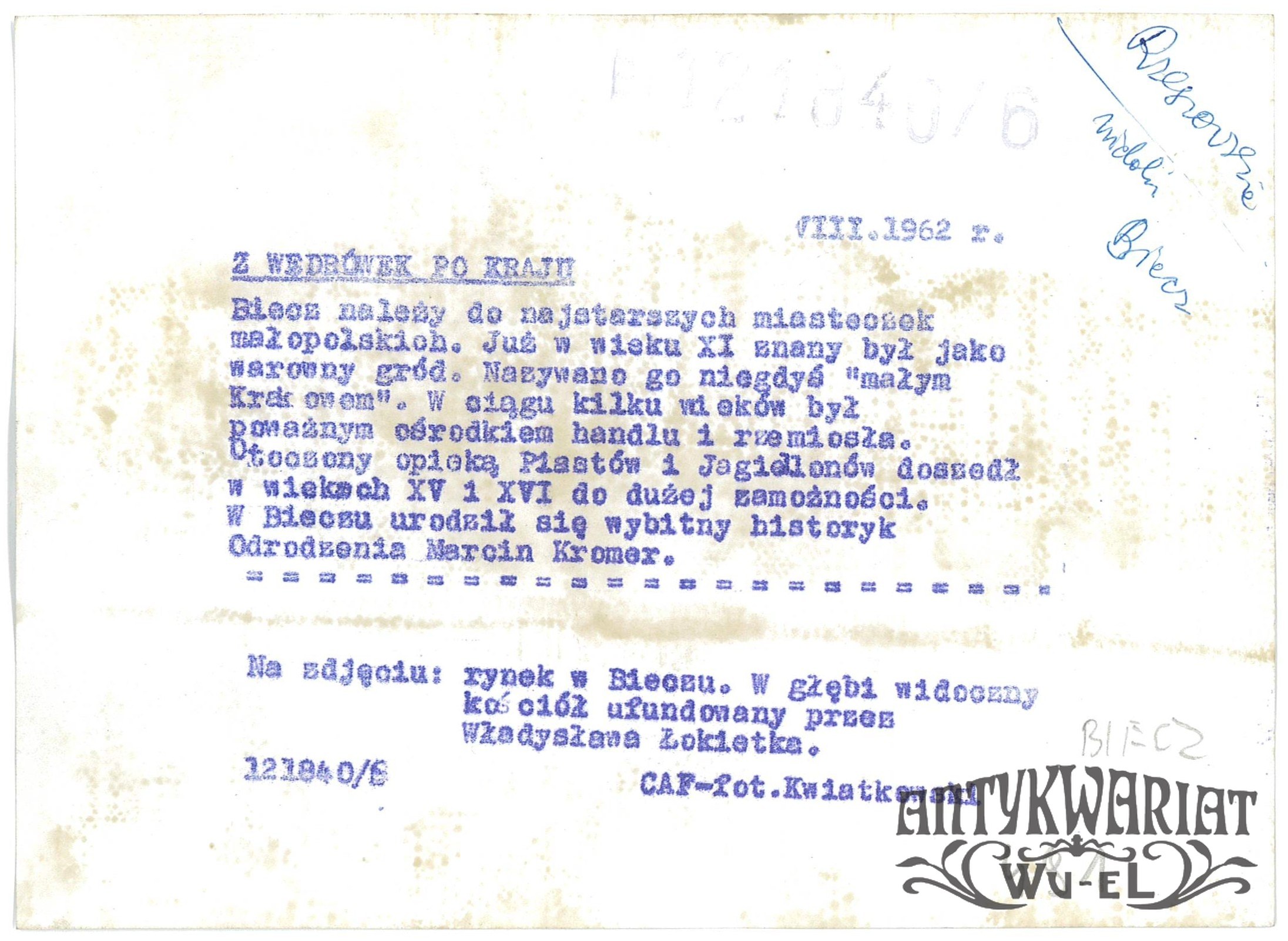 BIECZ. Rynek, w głębi kościół ufundowany przez Władysława Łokietka; fot. CAF - Kwiatkowski, sierpnień 1962 r.; stan bardzo dobry minus, wymiary: 18,1 x 13,1 cm.