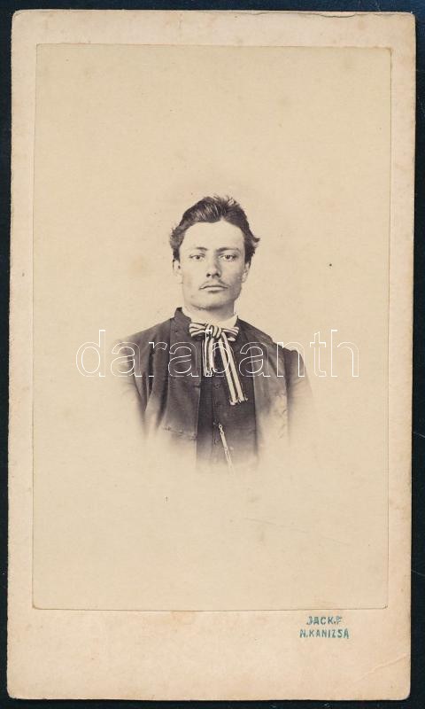 cca 1860 Jack Frigyes nagykanizsai órásmester műtermében készült keményhátú portréfotó, rajta ismeretlen férfival, 10x6 cm. Rendkívül ritka vizitkártya, aukción még nem szerepelt!