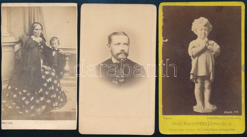 cca 1865-1873 Vegyes fotó tétel, 3 db, közte portréfotók (2 db) Alker Ede budavári és Borsos és Doctor pesti műtermeiből, valamint az 1873-as világkiállítás egy szobrának fotója (Klösz György fotó), keményhátú fotó, az Alkér fotó a szélein vágott, a Klösz fotó felületén kopásnyommal, 10x6 cm és 10x7 cm