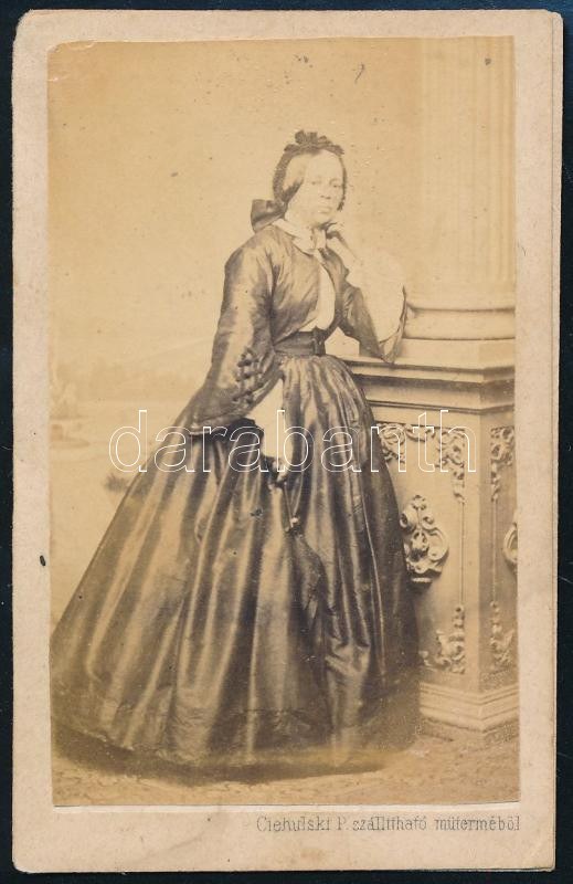cca 1870 Előkelő hölgy portréja, vizitkártya Ciehulski P. szállítható műterméből (Marosvásárhely), kissé ázott, 10x6,5 cm