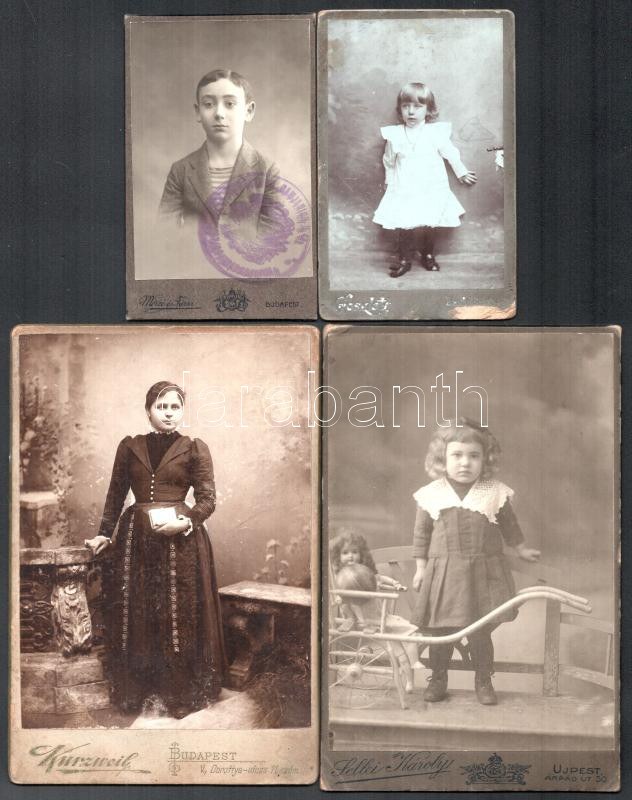 cca 1900-1910 össz. 4 db keményhátú portré fotó, közte 3 db gyerekportré, egyiken kislány játékokkal, tolható kocsival, babával és labdával, klf. budapesti műtermekből (Mérei, Kurzweil Frigyes, Goszleth) és Sellei Károly (Újpest). 11x7 és 16,5x11 cm közötti méretekben.