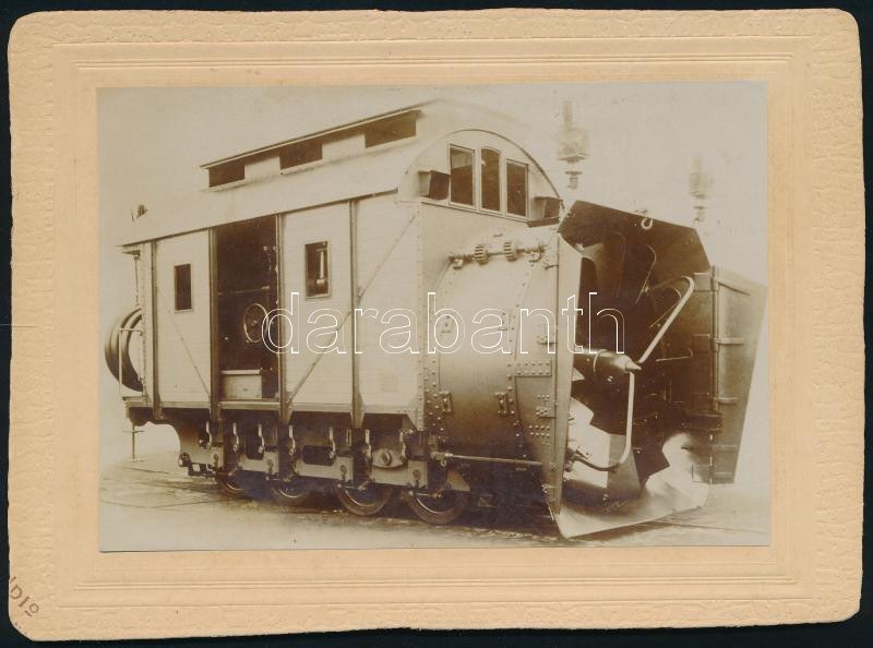 cca 1900 Hóhányó vasúti gép a MÁV Gépgyárban, keményhátú fotó, hátulján feliratozva, 13,5×18 cm / train snow plow
