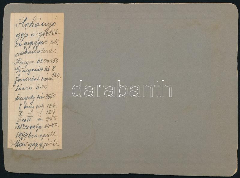 cca 1900 Hóhányó vasúti gép a MÁV Gépgyárban, keményhátú fotó, hátulján feliratozva, 13,5×18 cm ...