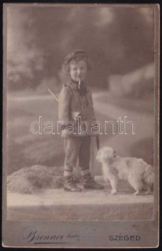 cca 1900 Vadásznak öltözött kisfiú, kutyával, játékpuskával, szájában pipával; keményhátú kabinetfotó a Brenner Testvérek szegedi műterméből, 16,5x10,5 cm