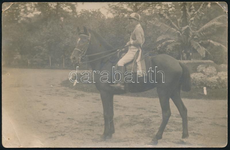 cca 1910-20 Fiú zsoké lovon, fotólap, A. Weiser verseci fényképész hátoldalán pecséttel jelzett felvétele...