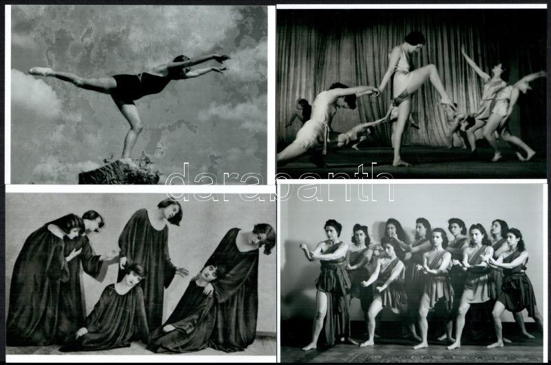 cca 1910 és 1940 közötti felvételek mozgásművészeti produkciókról műteremben, szabadban és előadáson, a néhai Népművelési Intézet táncoktatás/tánctörténet c. előadásának archívumából 13 db modern nagyítás, jelzés nélkül, 15x10 cm