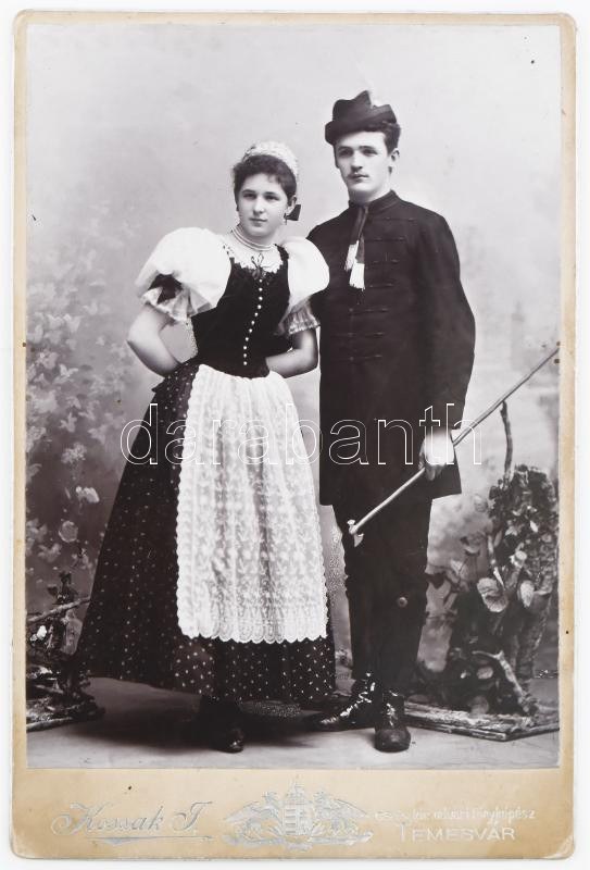 cca 1910, Férfi és nő magyaros ruhában, kabinetfotó, Kossak Lajos temesvári műterméből, 16,5x11 cm