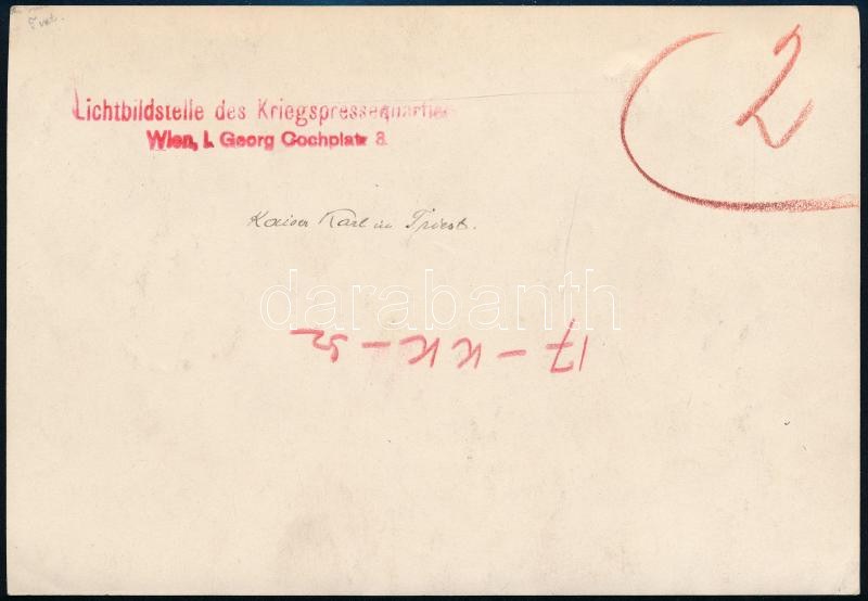 cca 1916-1918 Trieszt, IV. Károly érkezése alkalmából összegyűlt tömeg a városban. Eredeti fotó, a hátoldalon feliratozva, pecséttel jelzett (Lichtbildstelle des Kriegspressequartiers, Wien), felületén kis ázásnyommal, 17x12 cm / cca 1916-1918 Triest/Trieste, crowd gathered for the arrival of Charles I (Karl I) of Austria. Original photo, with description and stamp on the back (Lichtbildstelle des Kriegspressequartiers, Wien), with minor wet damage, 17x12 cm