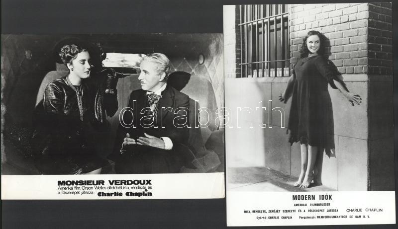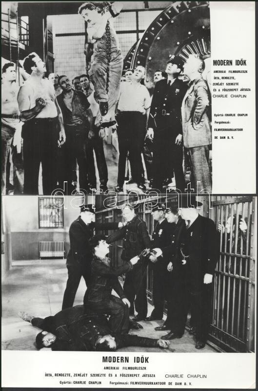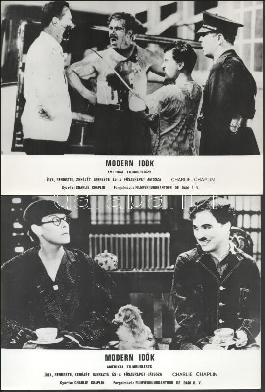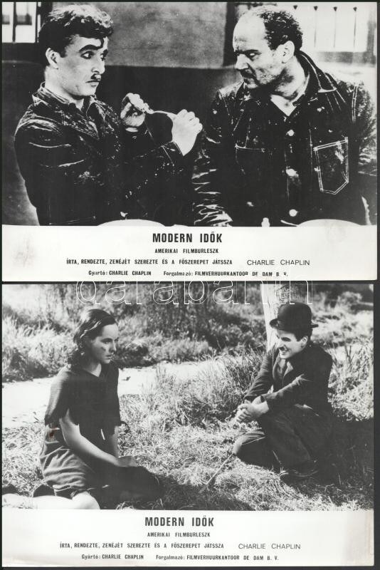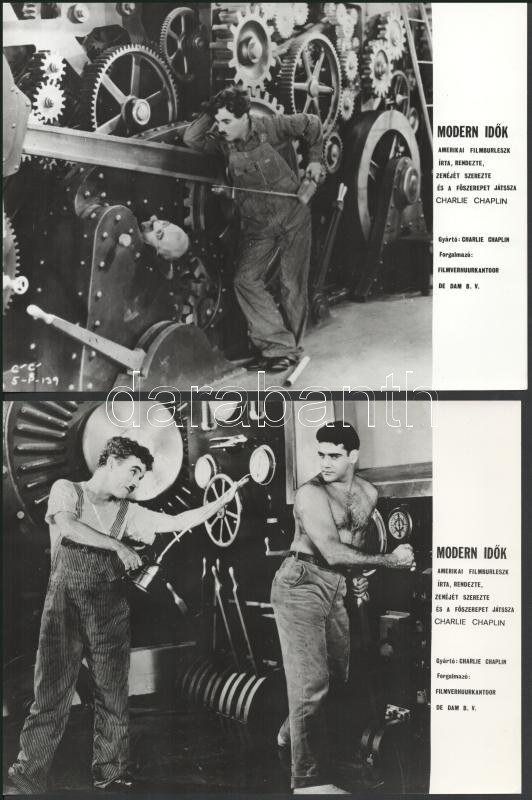cca 1939 előtt készült, "Modern idők" című amerikai film jelenetei és szereplői (főszereplő Charlie Chaplin), 25 db vintage produkciós filmfotó (vitrinfotó, lobbyfotó) ezüst zselatinos fotópapíron, a használatból eredő (esetleges) kisebb hibákkal, 18x24 cm