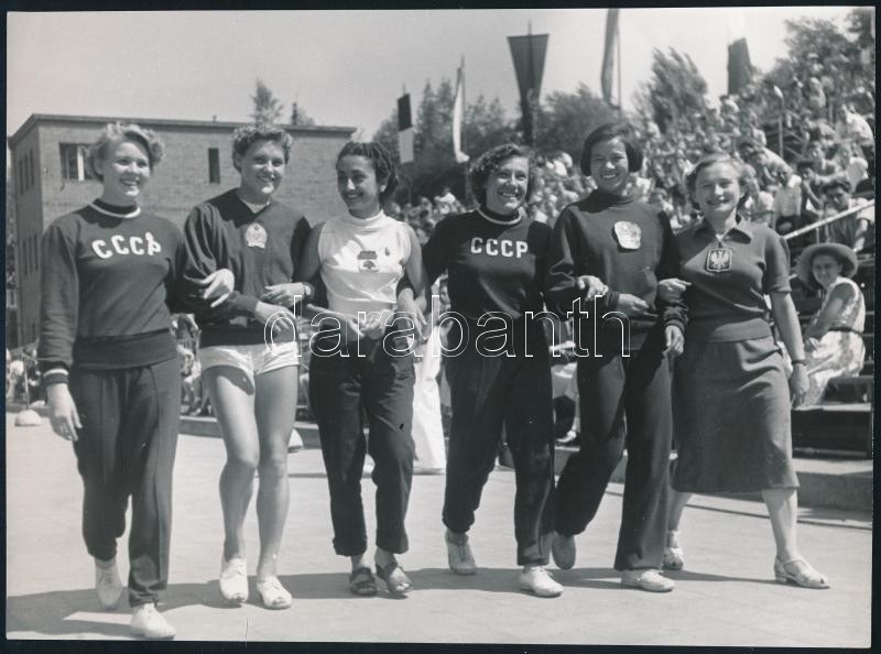cca 1952-1952 Bojár Sándor (1914-2000) Női sportolók fotója, rajta szovjet, magyar, kínai, lengyel...stb sportolókkal...