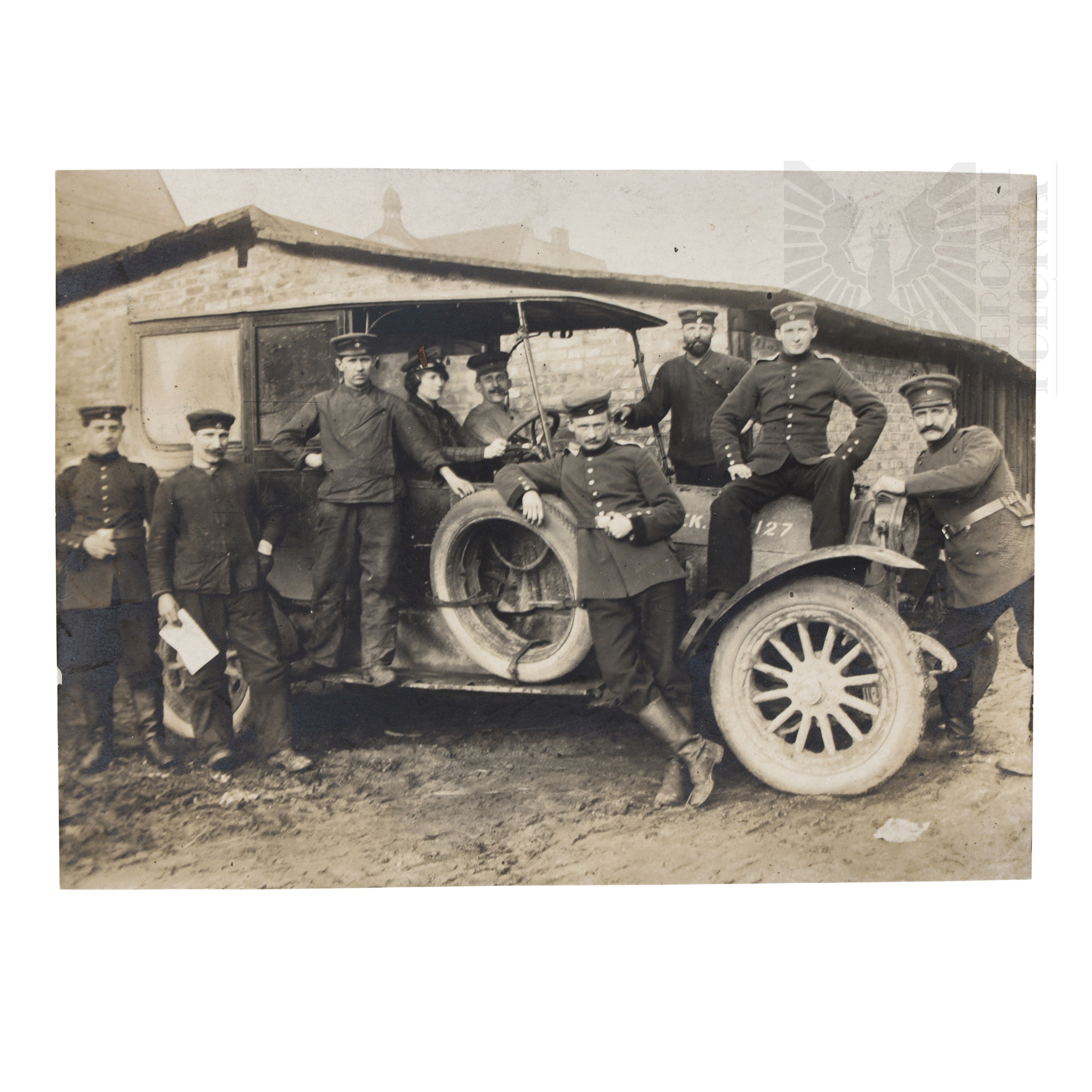 Fotografia grupowa żołnierzy Niemieckich przy samochodzie. Za kierownicą samochodu widoczna kobieta.