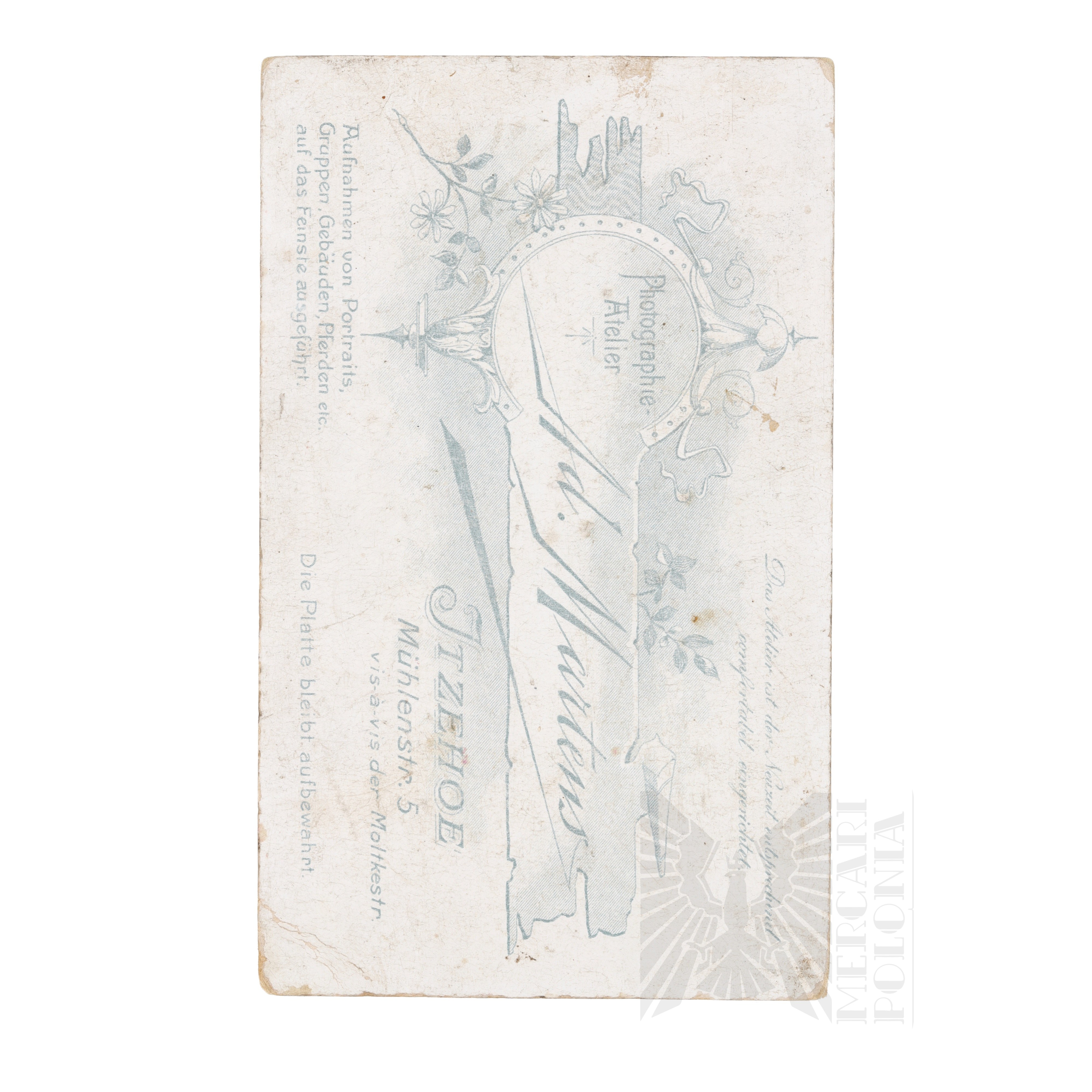 Fotografia żołnierza pruskiego na kartoniku wykonana przez zakład fotograficzny Ad. Martens w Itzehoe.