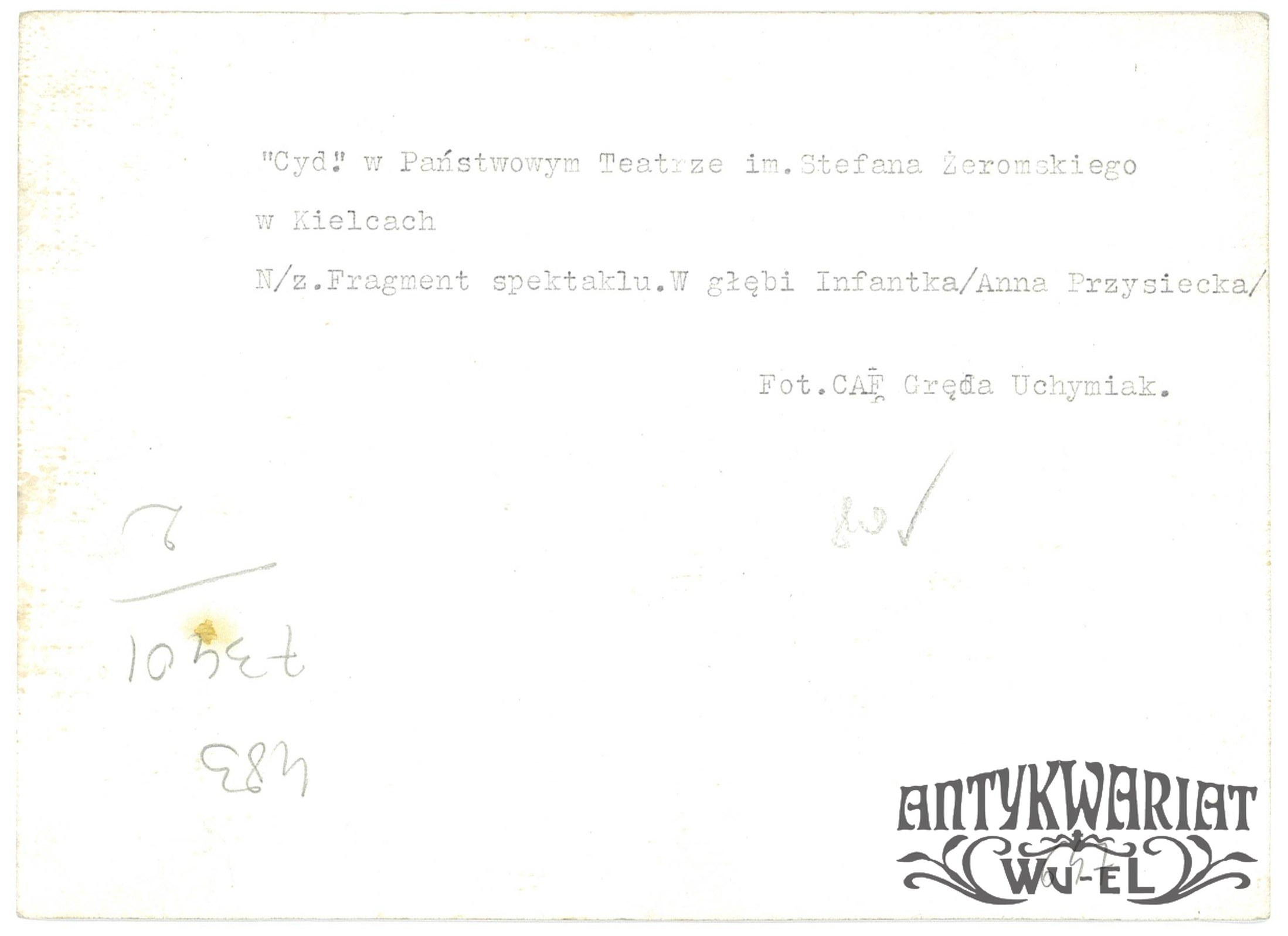 "CYD". Scena ze spektaklu w Państwowym Teatrze im. Stefana Żeromskiego w Kielcach, Anna Przysiecka w roli Infantki; fot. CAF - Gręda, Uchymiak; stan bardzo dobry, wymiary: 18 x 13,1 cm.