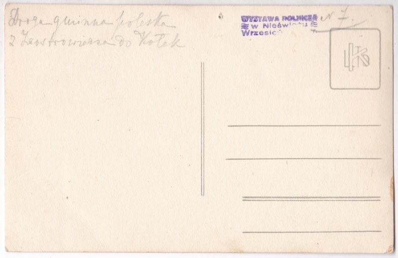 ca 14x9 cm, rewers liniowany, odręczny opis i pieczęć: „WYSTAWA ROLNICZA w Nieświeżu Wrzesień 1928 r.”, zabrudzenia, zgniecenie rogu, ślad po pinezce