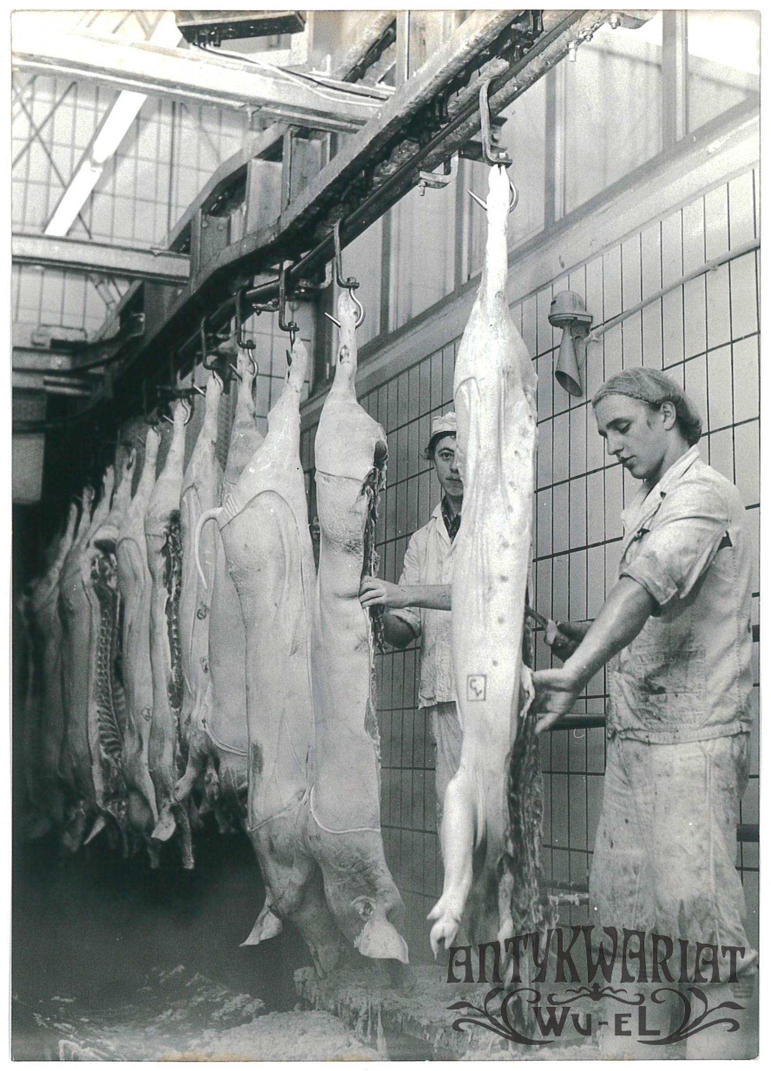 EŁK. Nowy kombinat mięsny, przygotowanie tusz wieprzowych do przerobu; fot. CAF - Sieńko, 30.12.1975 r.; stan bardzo dobry, wymiary: 13 x 18,2 cm.