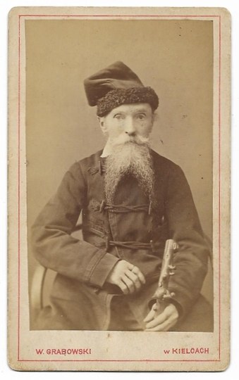 [FOTOGRAFIA portretowa - starzec - ujęcie w formacie card de visite]. [l. 80./90. XIX w.]. Fotografia form. 9,1x5,4 cm na oryg. podkładzie form. 10,7x6,5 cm, autorstwa W[incentego] Grabowskiego w Kielcach.