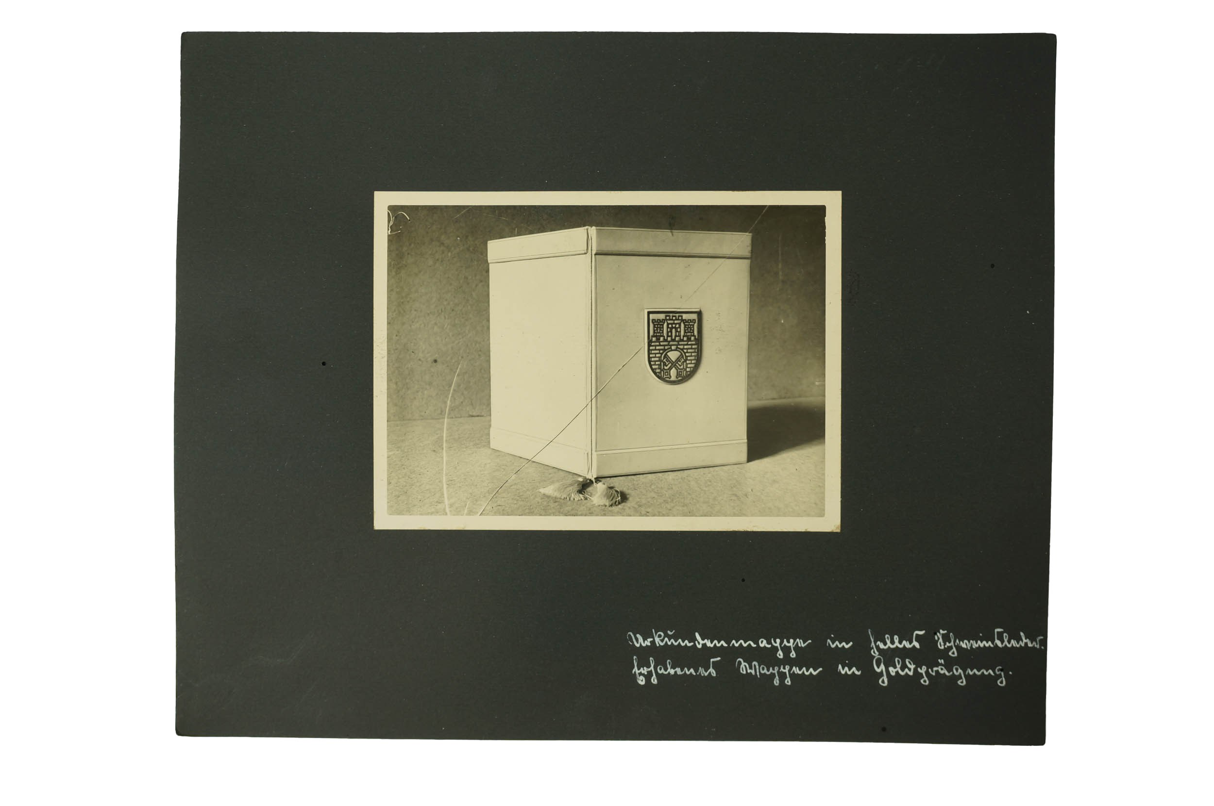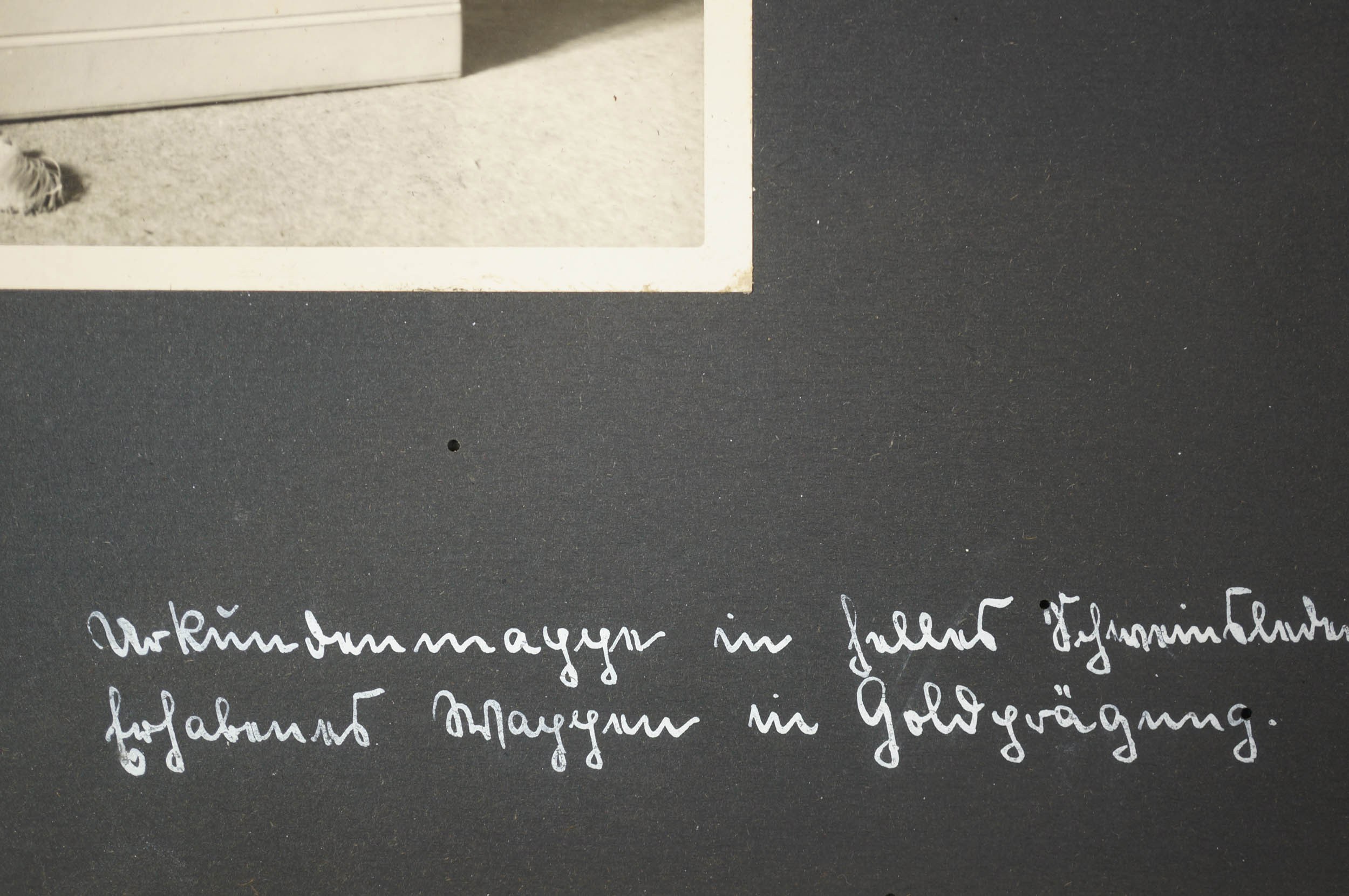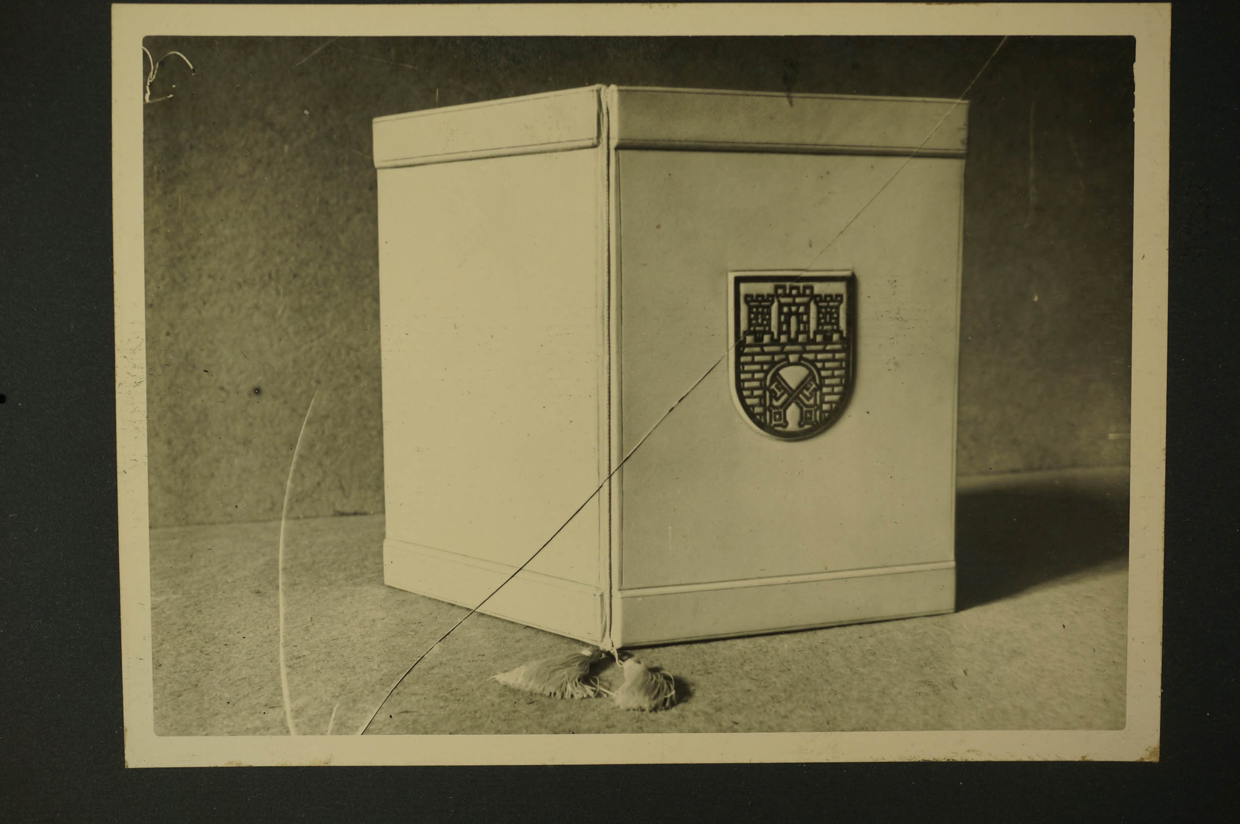 Fotografia przedstawiająca oprawę dyplomu miasta Poznania, wykonaną w czasie okupacji przez zakład introligatorski Ludwiga Albrechta mieszczący się w Poznaniu przy Berlinerstrasse 5, fotografia naklejona na większą kartę, pod fotografia opis w języku niemieckim, f. 33,5x27cm [karta], 13x18cm [zdjęcie]. Na kolejnych pozycjach oferujemy inne fotografie z pracami tego introligatora.