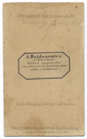Portretowany ujęty w popiersiu, w owalu. Zdjęcie naklejone na oryg. kartonowy podkład. Na odwrocie wyzłocona reklamowa winieta zakładu. W centrum na odwrocie naklejka: "A. Bogdanowicz we Lwowie. Skład papierów i wszelkich potrzeb do pisania, rysowania i malowania". Miejscowe zaplamienia.