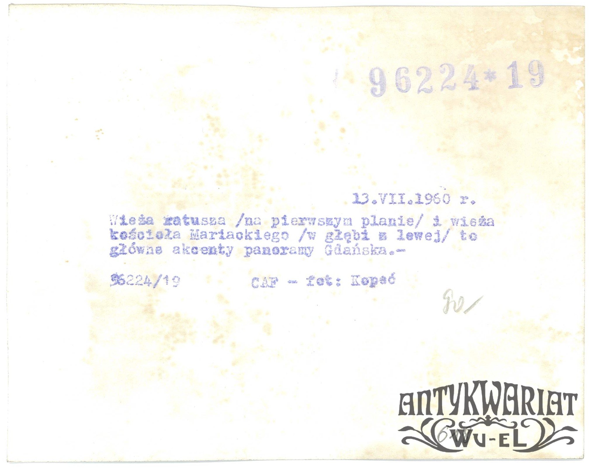 GDAŃSK. Wieża Ratusza i kościoła Mariackiego; fot. CAF - Kopeć, 13.07.1960 r.; stan bardzo dobry minus; stan bardzo dobry minus, wymiary: 16,7 x 13,2 cm.