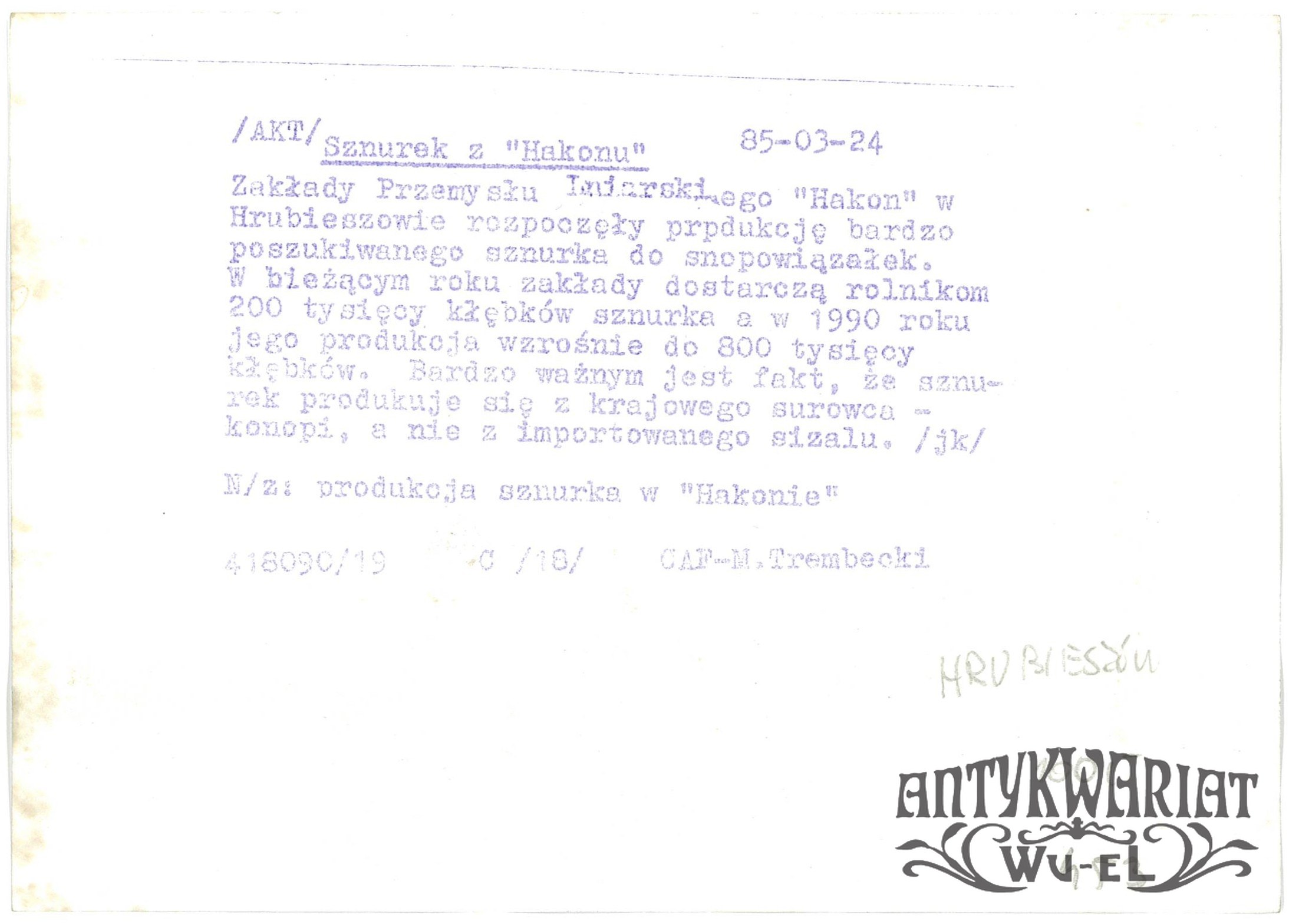 HRUBIESZÓW. Zakład Przemysłu Lniarskiego "Hakon", produkcja sznurka do snopowiązałek; fot. CAF - M. Trembecki, 24.03.1985 r.; stan bardzo dobry, wymiary: 18,2 x 12,9 cm.