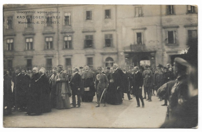 Rada Regencyjna udająca się na Zamek po złożeniu przysięgi w katedrze. Widoczny m.in. ks. prałat Zygmunt Chełmicki, sekretarz Rady. Widoczni również licznie zgromadzeni oficerowie i żołnierze Legionów, duchowieństwo. W lewym górnym narożniku nadruk: "Uroczystość wprowadzenia Rady Regencyjnej Warszawa, d. 27-X 1917 r.". Narożniki lekko otarte, na odwrocie miejscowe zaplamiania, poza tym stan dobry.