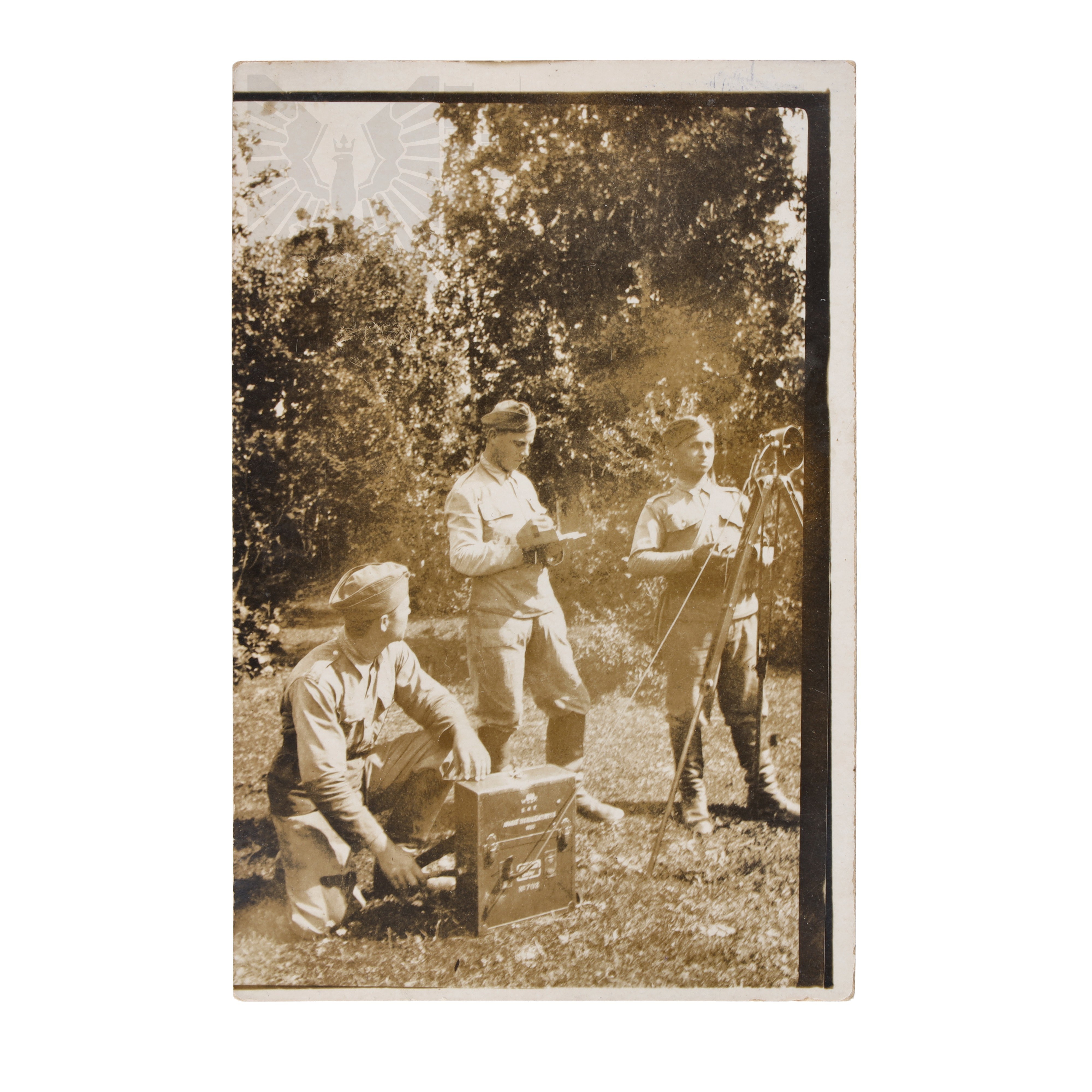 Zdjęcie oddziałów żołnierzy Wojska Polskiego z wyposażeniem łączności, dobrze widoczne skrzynie. Zdjęcie pochodzi z zespołu pamiątek po żołnierzu Korpusu Ochrony Pogranicza. Na rewersie napis ołówkiem: "Na rewersie napsi "Pamiątka z manewrów, Sygnalizacja świetlna, Warszawa dn 10/XVIII 35r" Tyrański Rudole Staffel Erwin (?) , Kiełbasa Stefan"