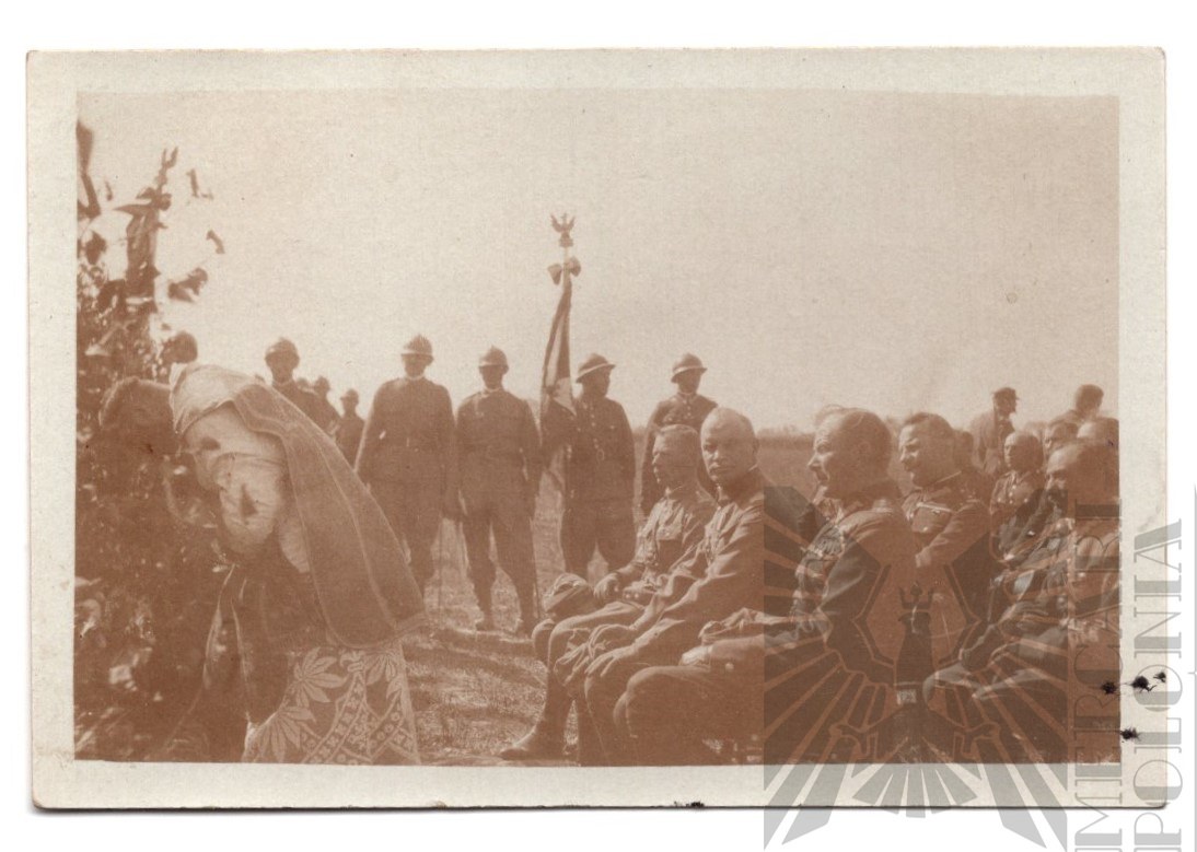 Fotografia ukazująca msze polową oraz sztandar nieznanej jednostki wojskowej kawalerii.