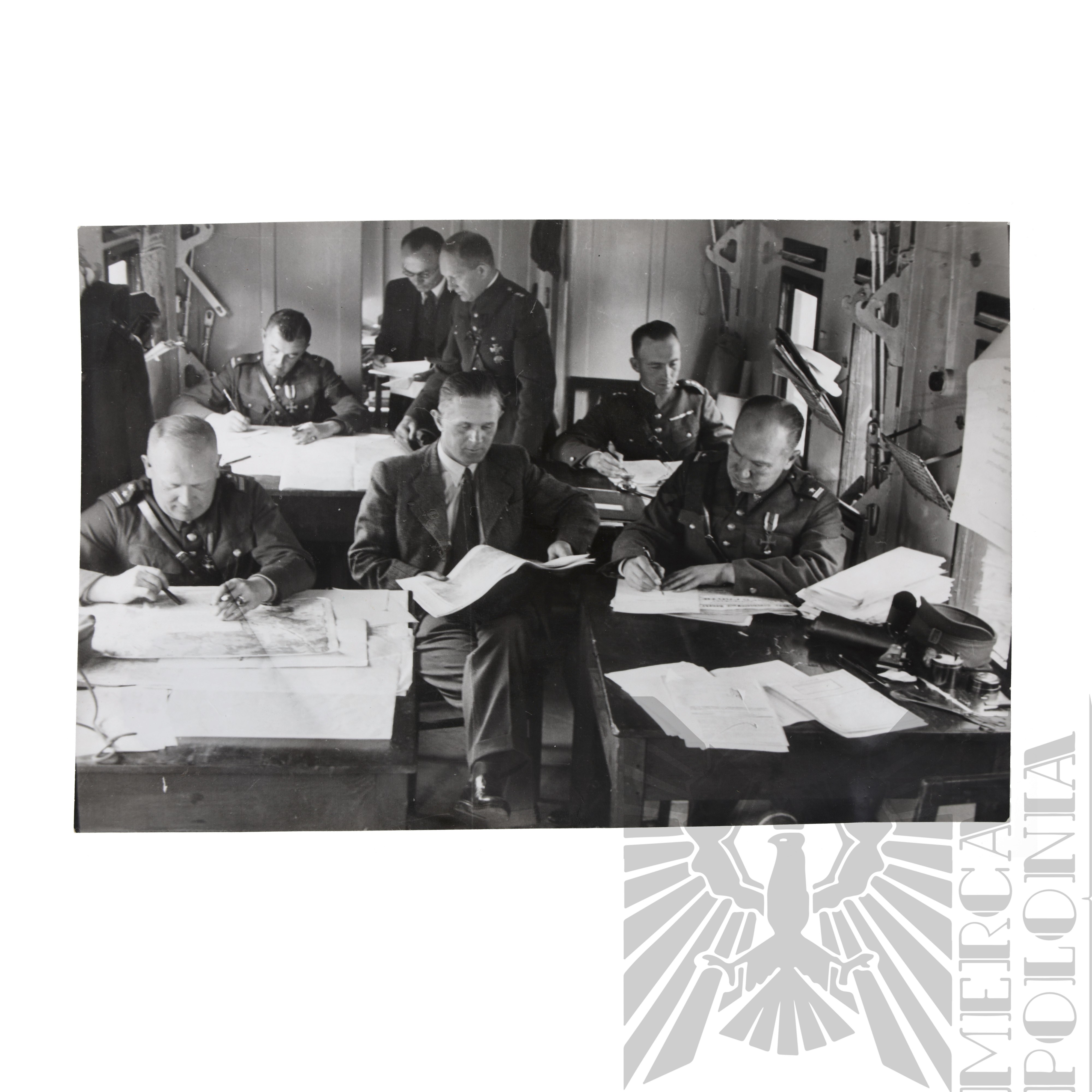 Fotografia oficerów pracujących nad mapami, dobrze widoczne umundurowanie wz.36, na piersi jednego z oficerów widoczny krzyż Virtuti Militari. Obok niego oficer z widocznym Krzyżem Walecznych.