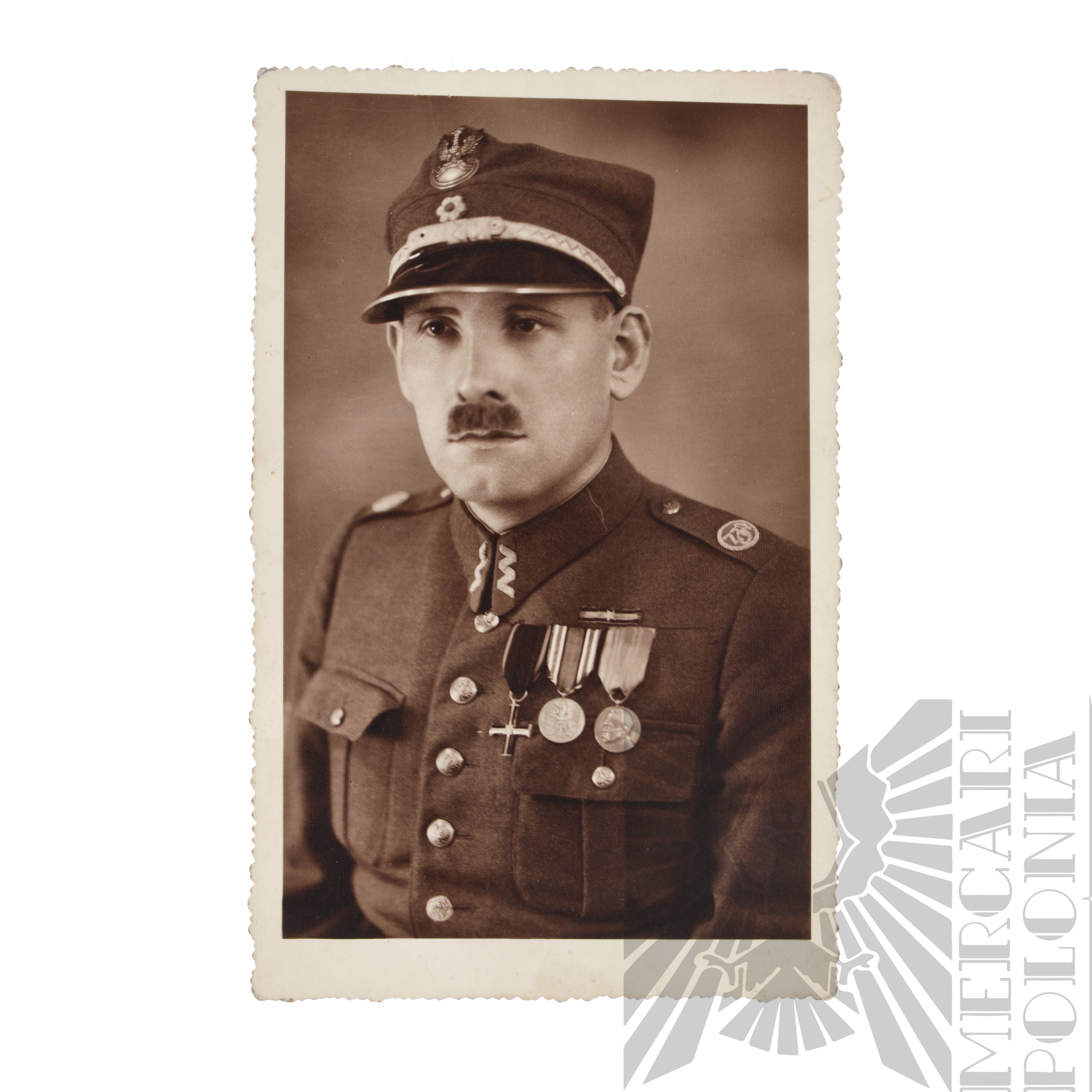 Fotografia portretowa członka Związku Oficerów Rezerwy. Na mundurze doskonale widoczne odznaczenia takie jak Krzyż Niepodległości, Medal Za Wojnę Polsko-Bolszewicką, Medal 10-Lecia Odzyskania Niepodległości oraz Odznaka Za Rany i Kontuzje z dwiema gwiazdkami. Na rogatywce doskonale widoczny orzeł wz.19.