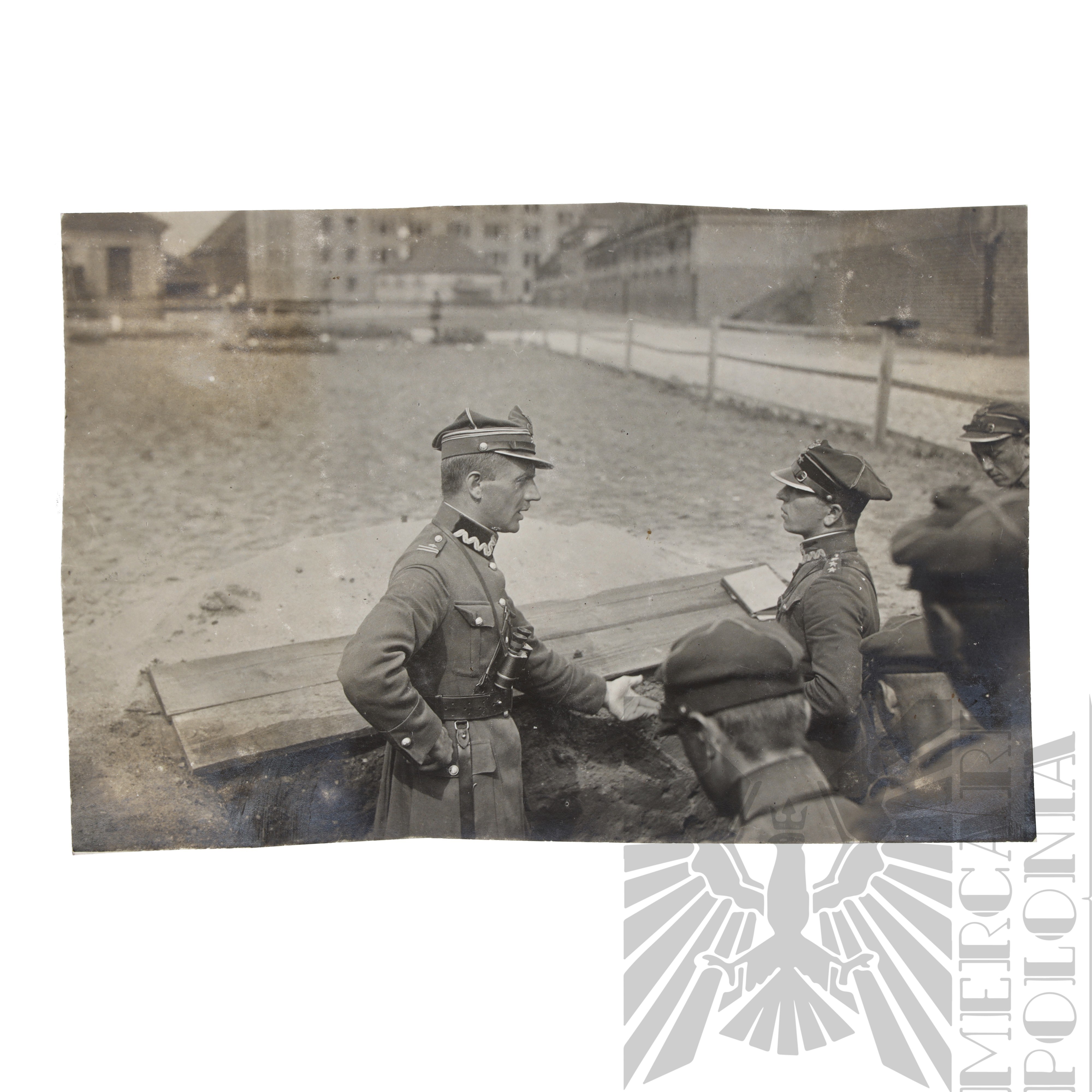 Fotografia przedstawiająca strzelnicę wojskową w okresie międzywojennym, dobrze widoczne umundurowanie takie jak kurtki oficerskie wz.27 i rogatywki wz.19, oficer po prawej na kołnierzu prawdopodobnie proporczyk Artylerii Konnej.
