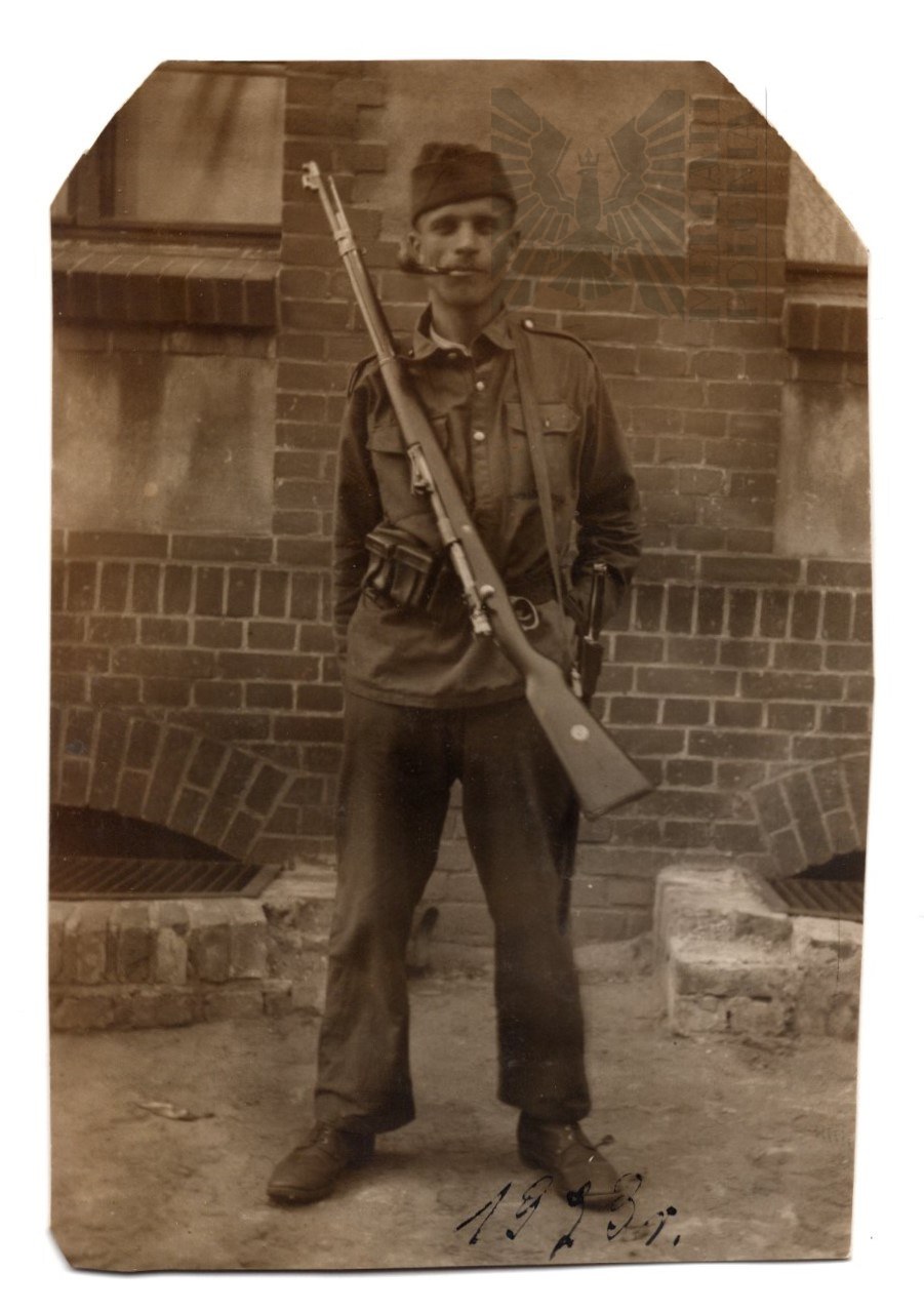 Fotografia żołnierza Wojska Polskiego we wczesnym okresie istnienia armii polskiej. Widoczna letnia koszula żołnierska, pas z ładownicami wz.22 oraz karabin Mausera. Na dole fotografia opatrzona podpisem "1923 r.”