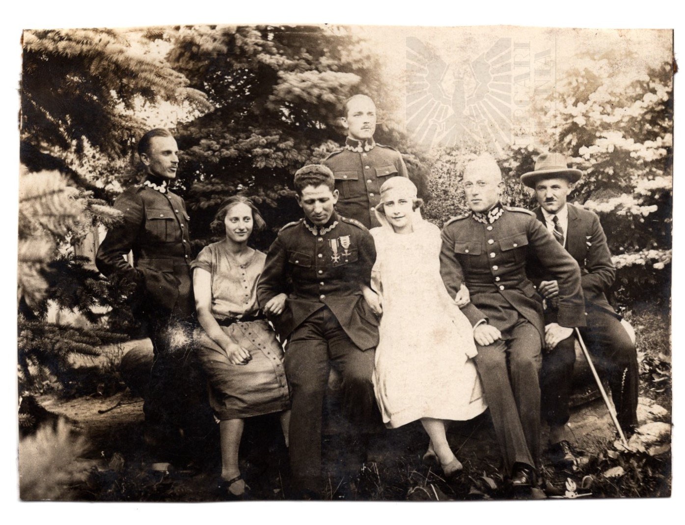Fotografia żołnierzy Wojska Polskiego z cywilami prawdopodobnie podczas wycieczki, u żołnierza w środku na piersi widoczny Krzyż Virtuti Militari oraz Krzyż Walecznych z 3-krotnym okuciem.