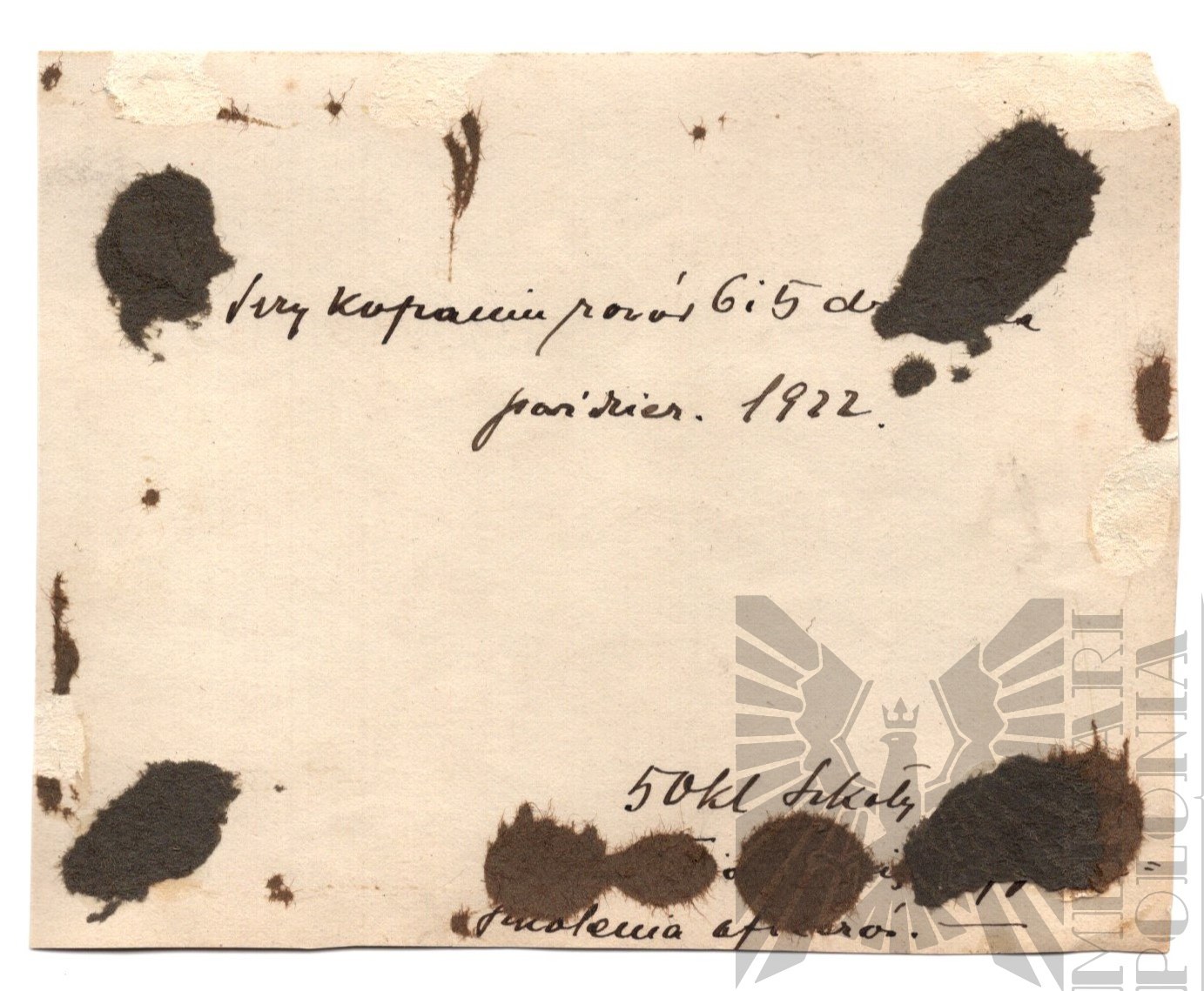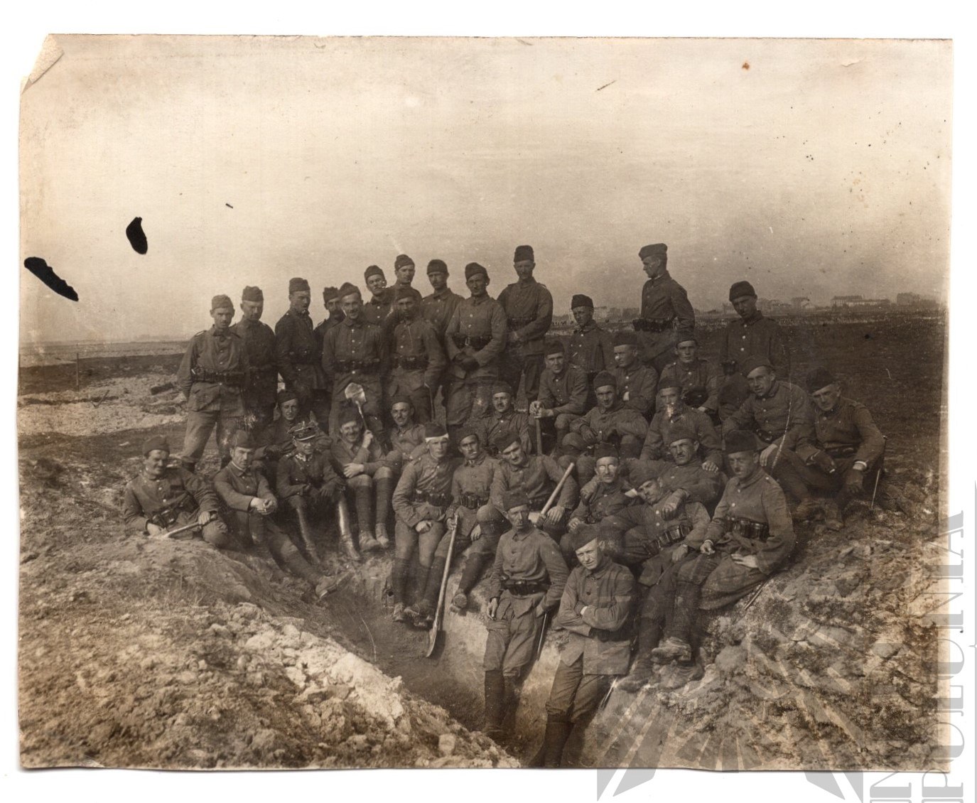Fotografia żołnierzy Wojska Polskiego w przerwie podczas kopania rowów. Na rewersie widoczny podpis „Przy kopaniu rowów 6 i 5 d[...?] paździer. 1922 50kl (?)"